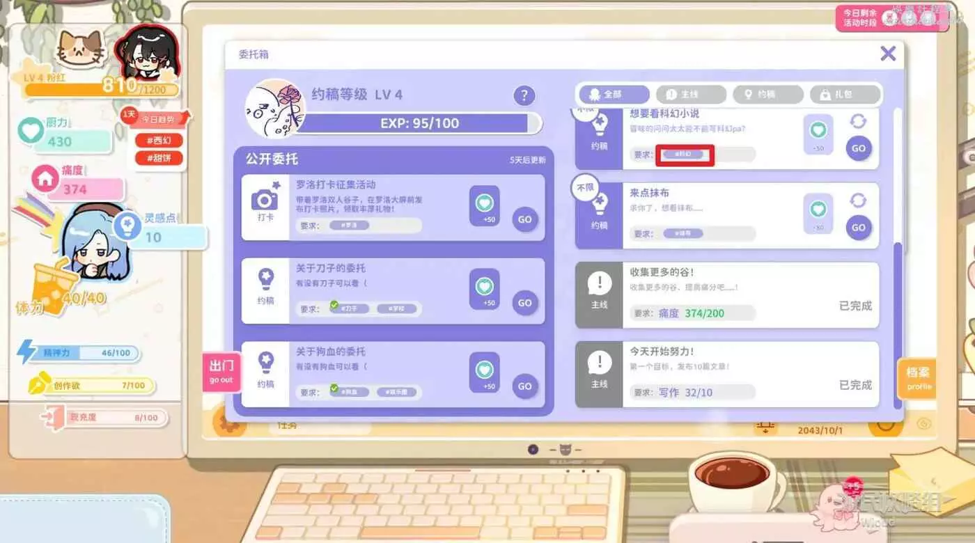 玩家可以在遊戲內接取委託來賺取廚力,打開委託箱即可看到目前的約稿等級與可接取的委託。