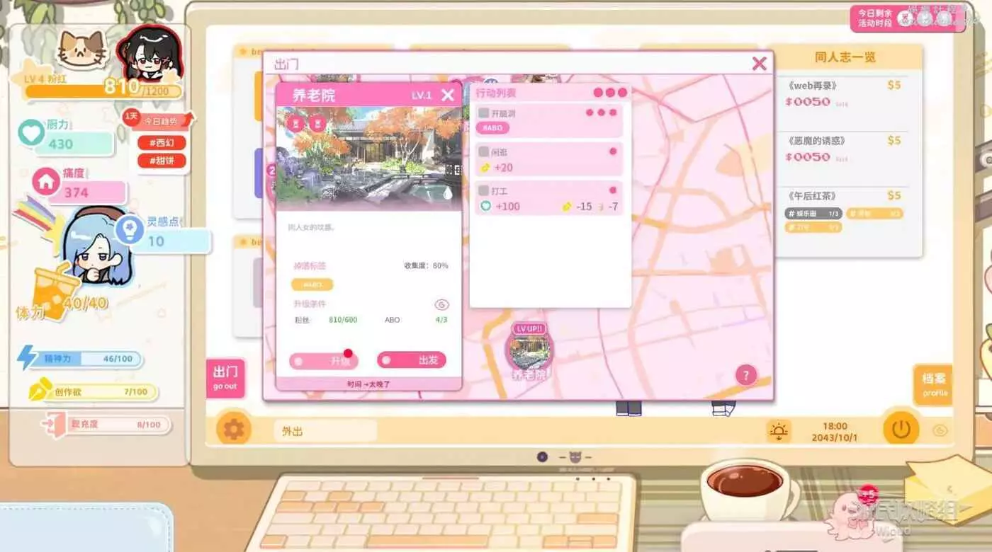 主頁面點擊出門即可外出,外出的時候,可以進行各種活動、收集靈感,每個地點有對應標籤的靈感,可以開腦洞來獲得,除此以外,還可以調節你的屬性。