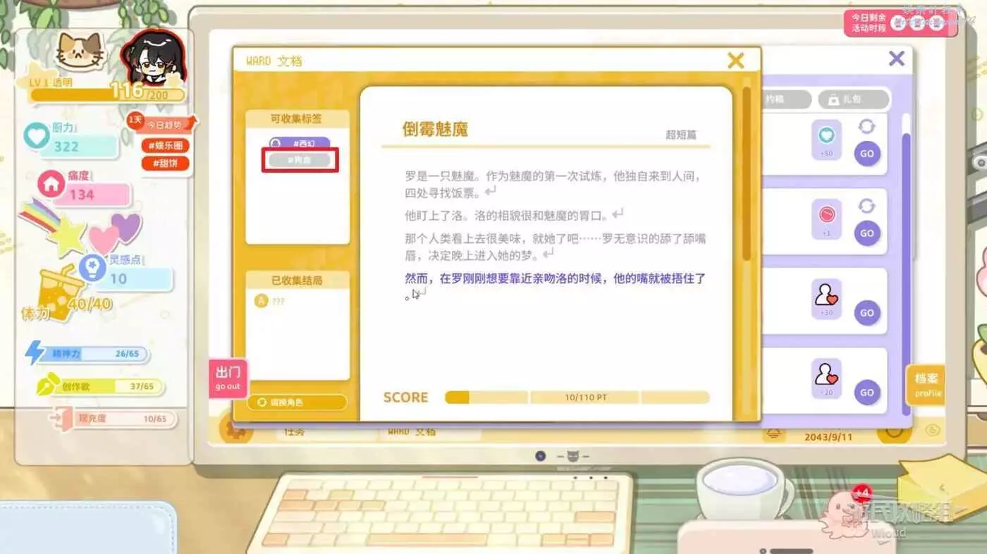 在委託頁面查看此委託需要的靈感標籤,規劃好時間外出前往特定地點獲取這個標籤,回到主頁面進入寫作工具,點擊對應標籤的文章開坑。
