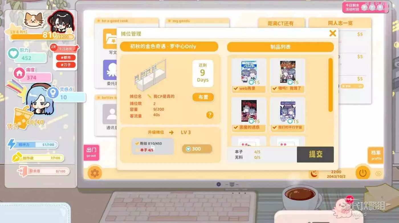先跟隨主線解鎖攤位功能,攤位售賣的製品為同人志與無料。