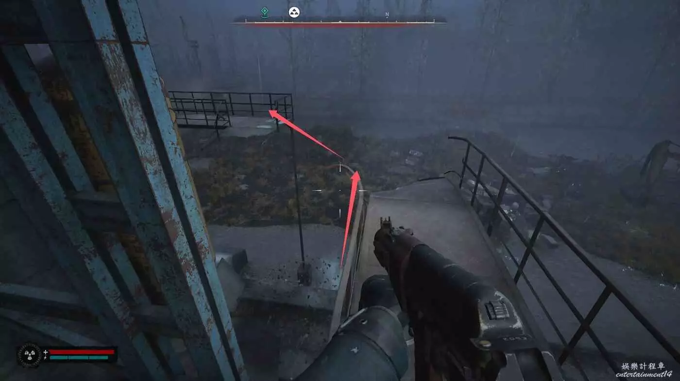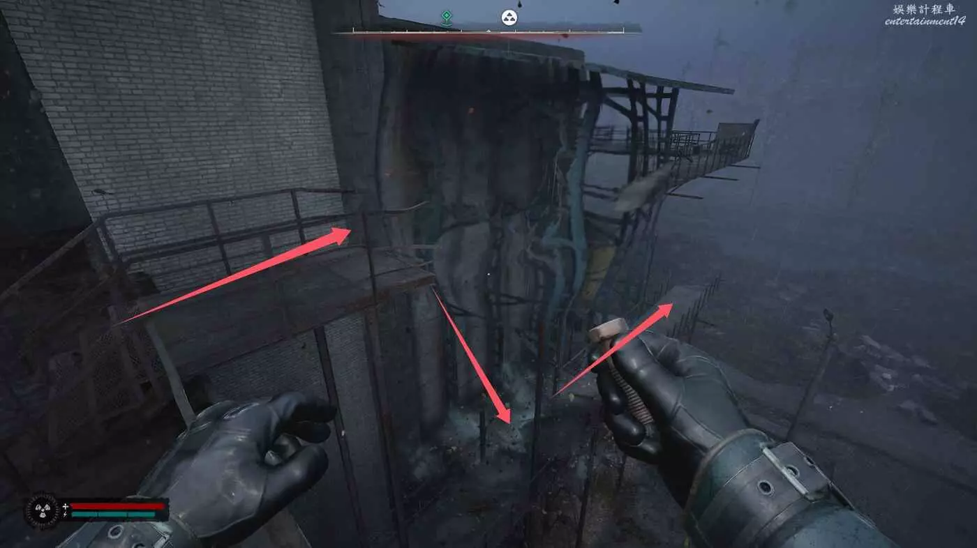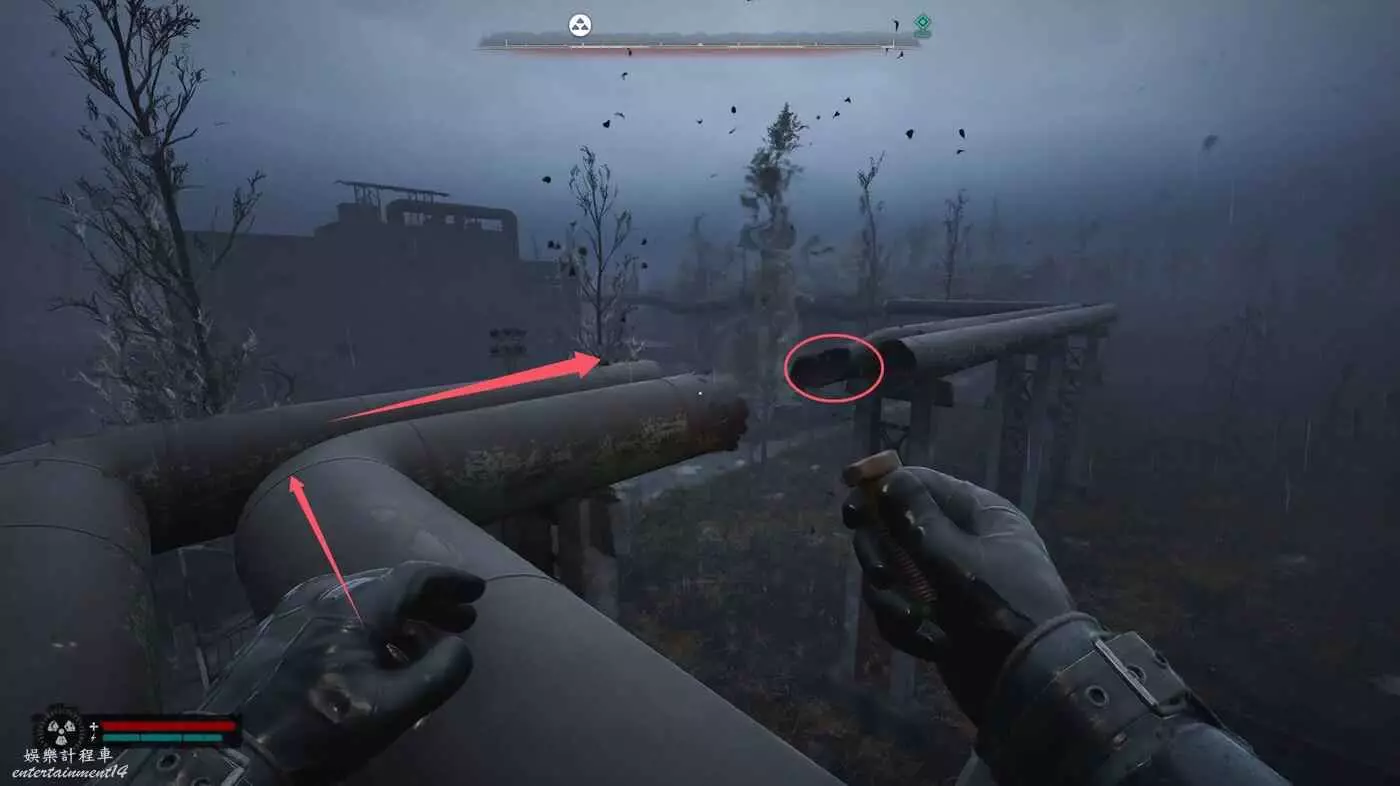 從梯子上樓,然後一路跑酷,管道中間的縫隙不會掉下去,建議提前存檔。一定要多留一點衝刺距離,否則跳不了多遠。