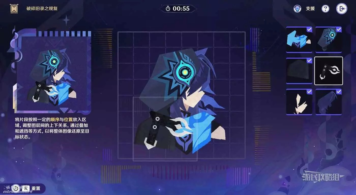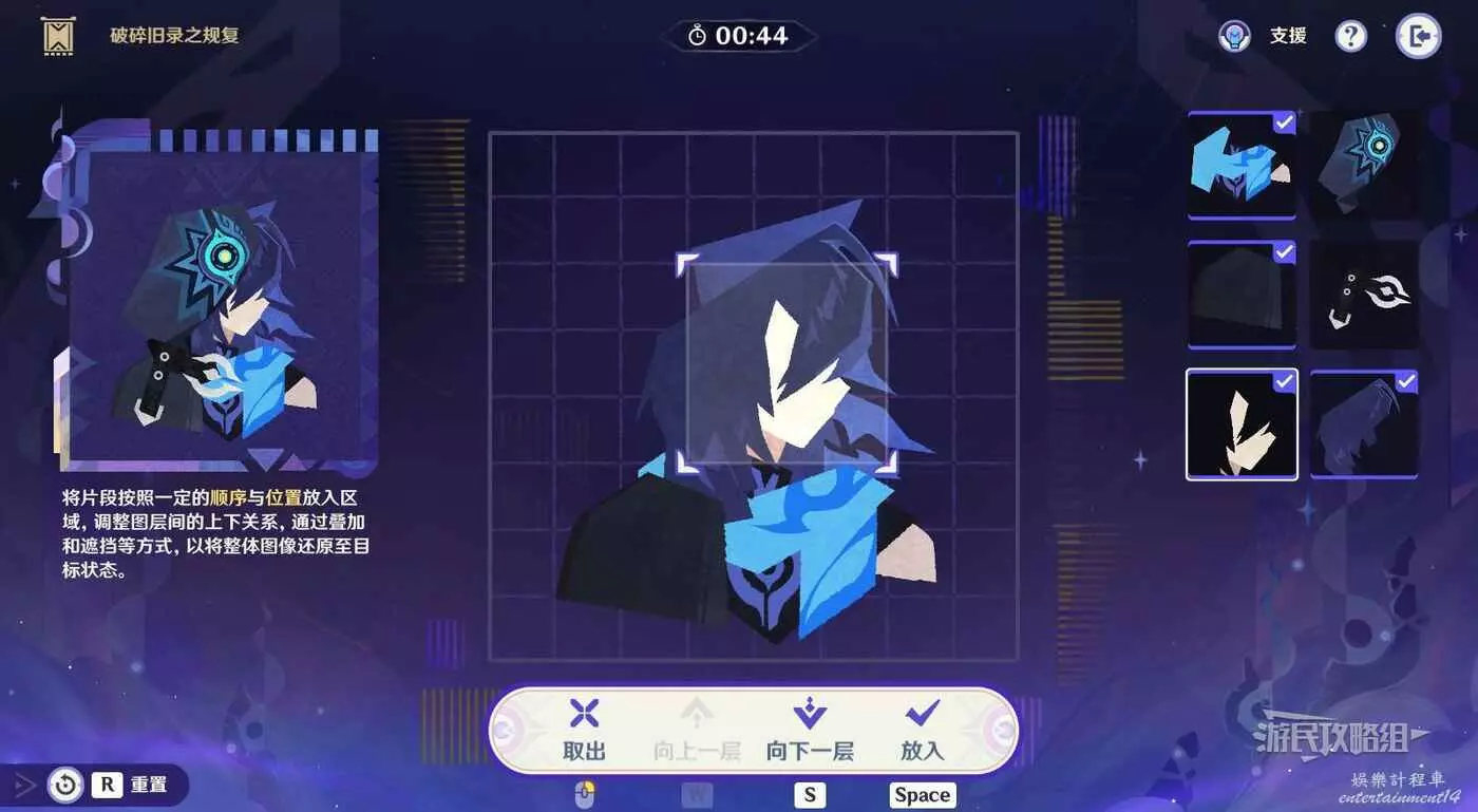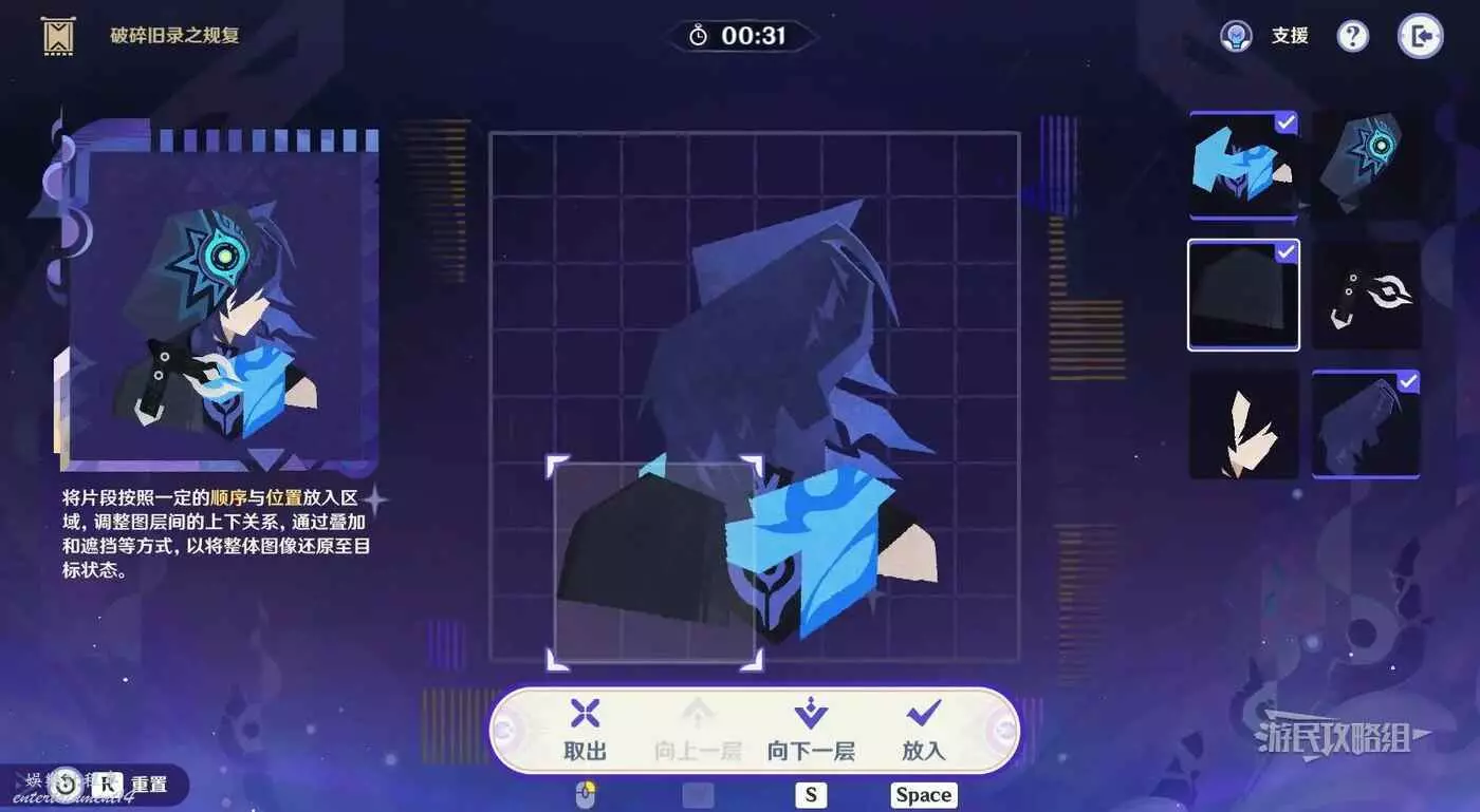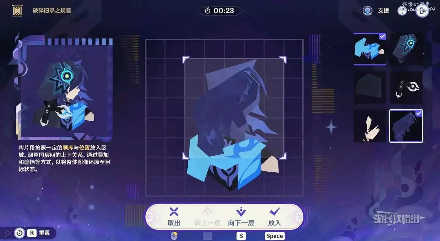 第1步,選擇第一行第一列的碎片放入拼圖,疊放在背景頭髮碎片的下方。