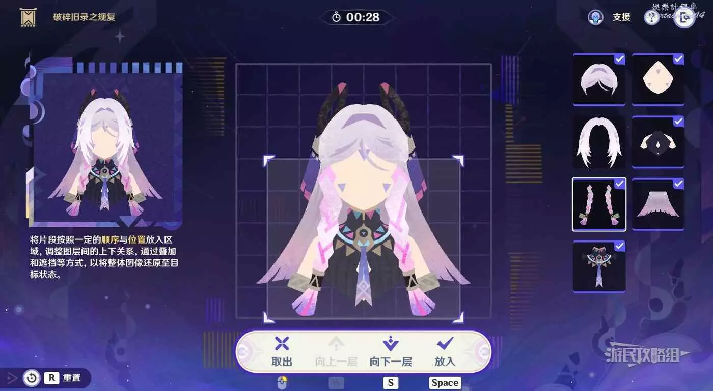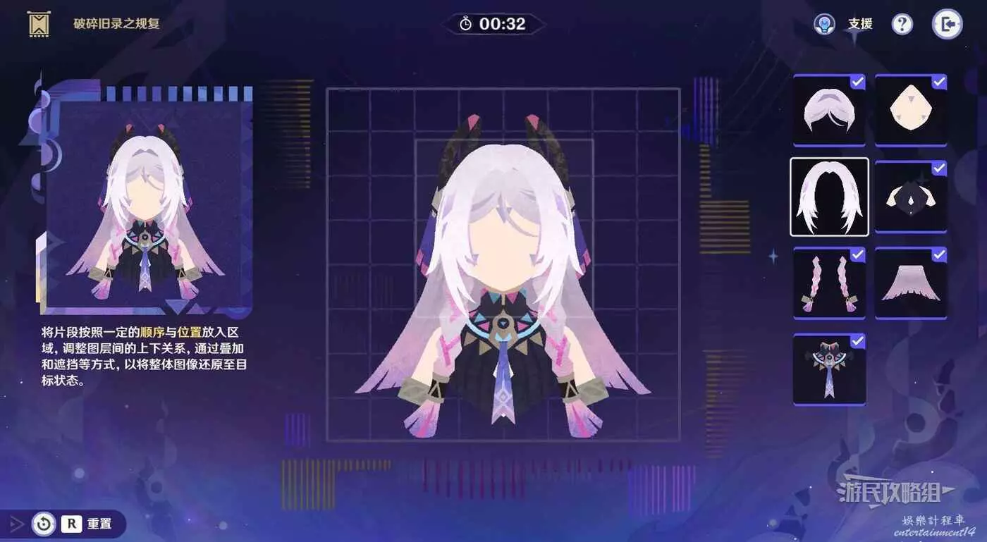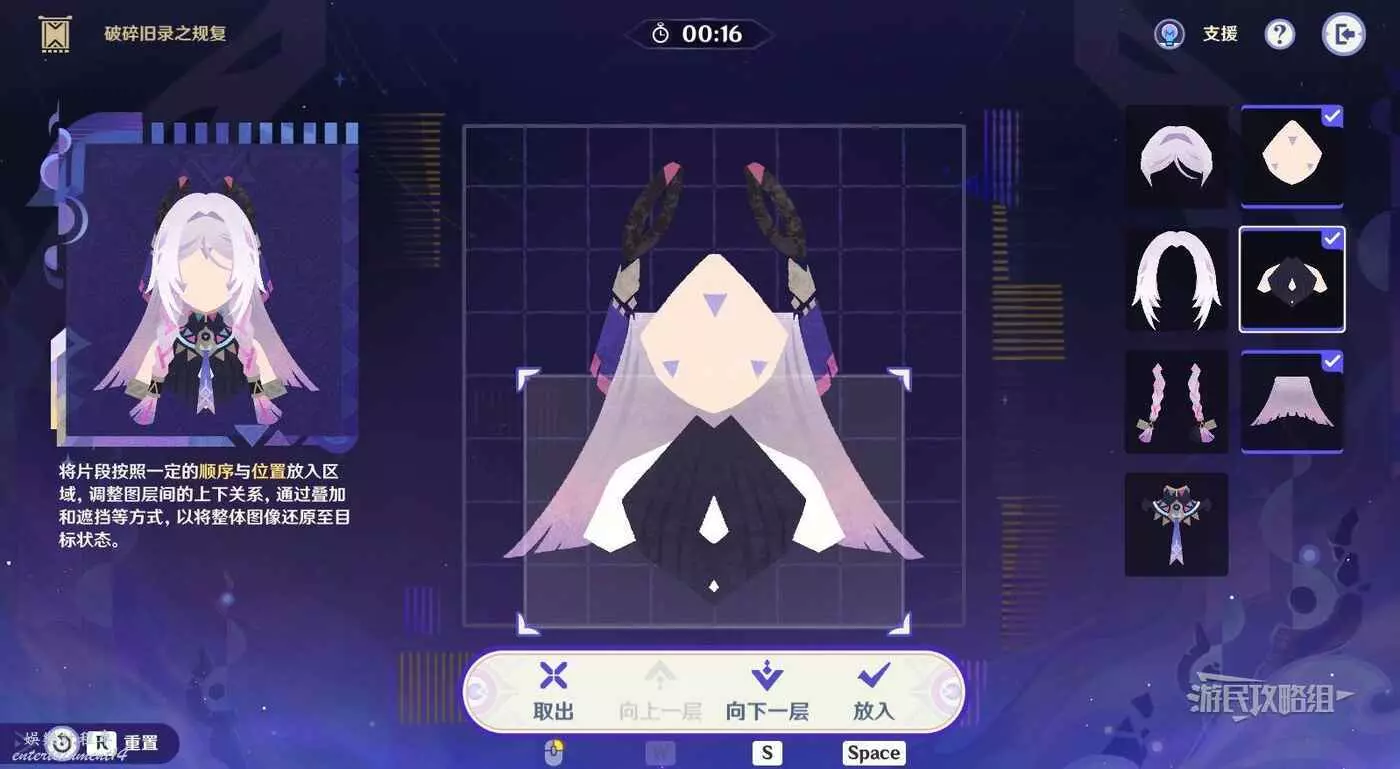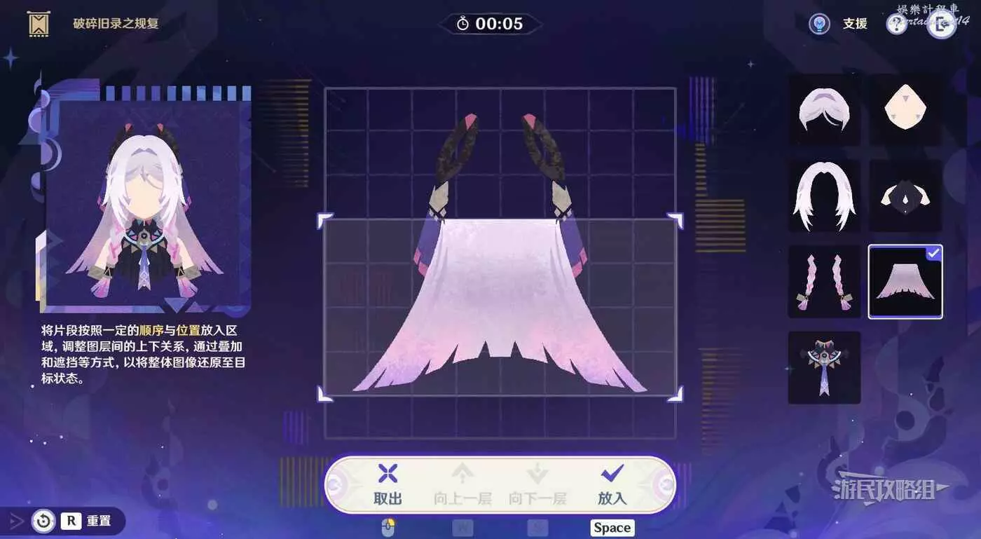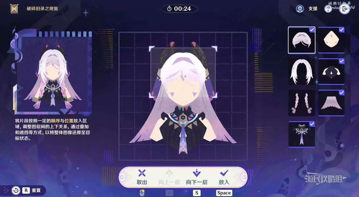第1步,選擇第三行第二列的頭髮碎片放入拼圖,放在背景發飾的正下方。