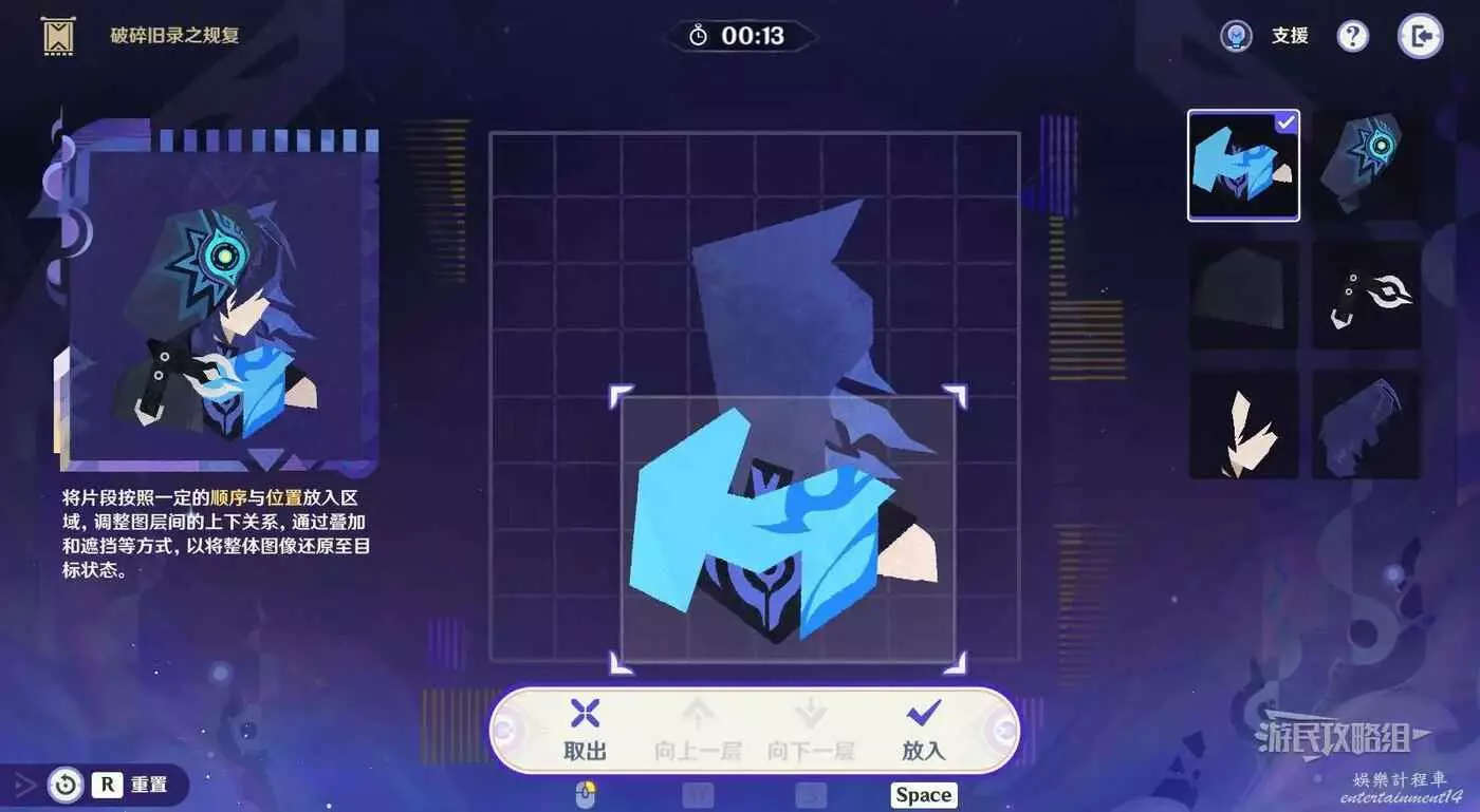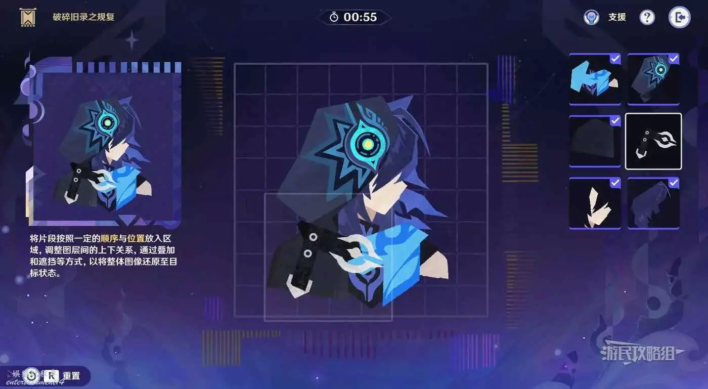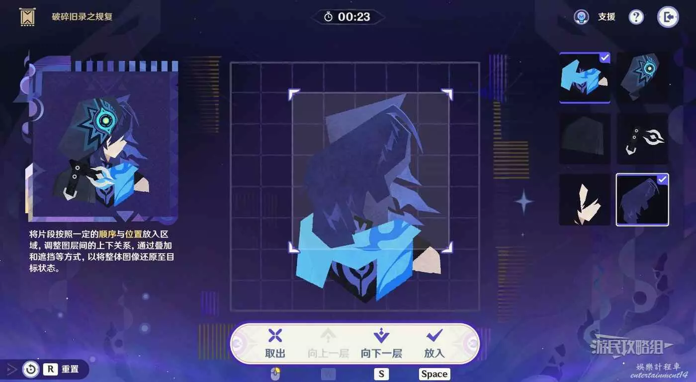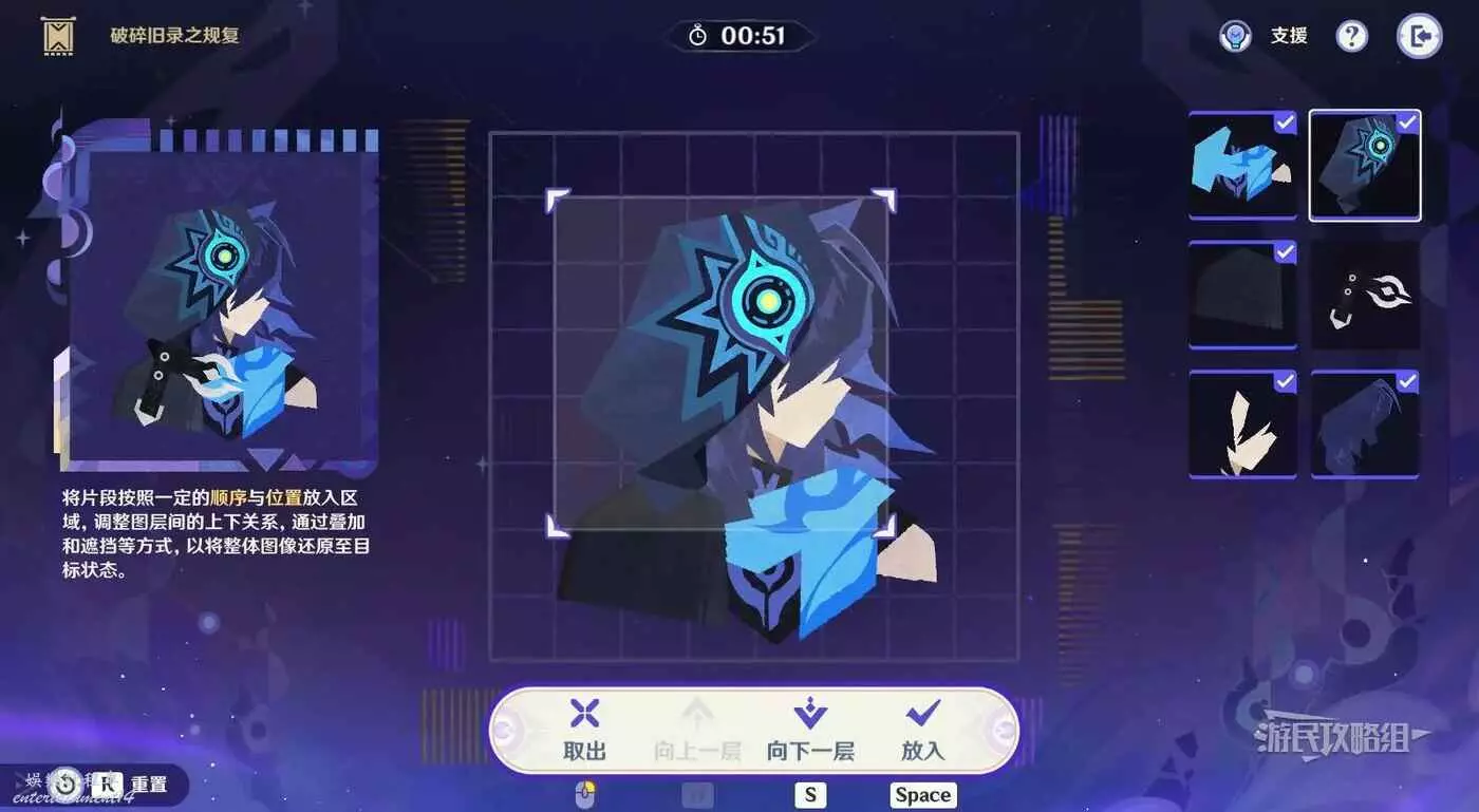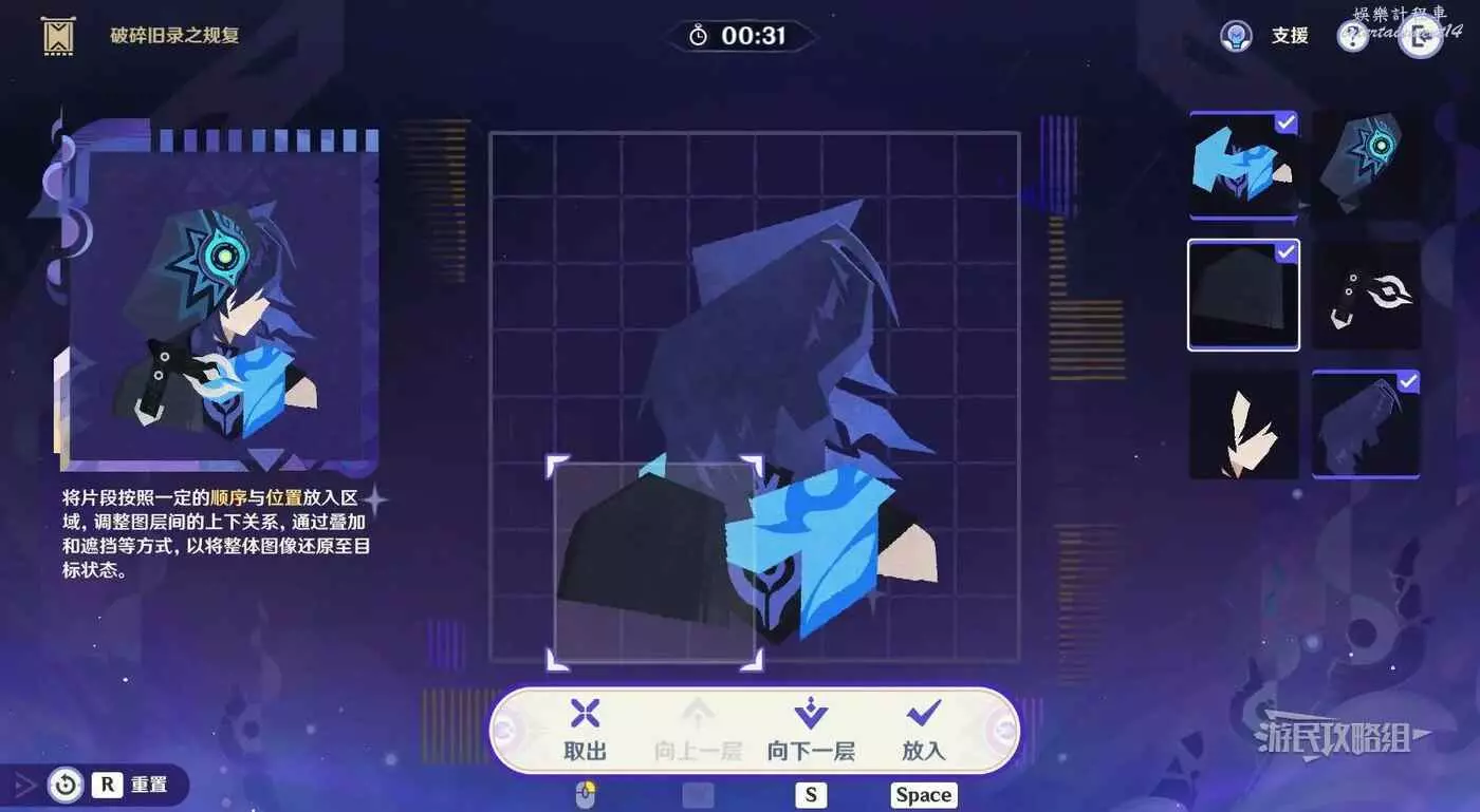 第1步,選擇第一行第一列的碎片放入拼圖,疊放在背景頭髮碎片的下方。
