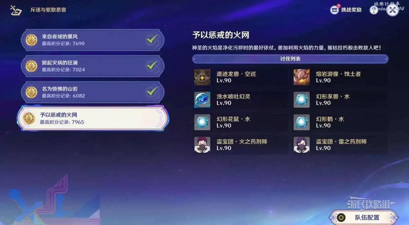 第四關主要利用火元素攻擊和重擊來觸發增益,儘量搭配火系副C和重擊主C結合的陣容。綜上恰斯卡和林尼比較符合條件,一個人就能滿足所有要求,並且林尼的二段攻擊是算2次重擊的,另外也可以考慮用僕人(需要重擊)、胡桃(需要重擊)、迪盧克(需要爆發)和煙緋(疊印重擊)來當做主C,根據自己的角色練度來搭配即可。同時考慮到敵人包含濁水幻靈和水幻形類敵人,隊伍中儘量不要加入水系角色。除此之外由於只能使用自己的角色,沒有試用,因此建議優先使用自己已經培養好的角色,然後再搭配滿足要求的角色來觸發增益即可。