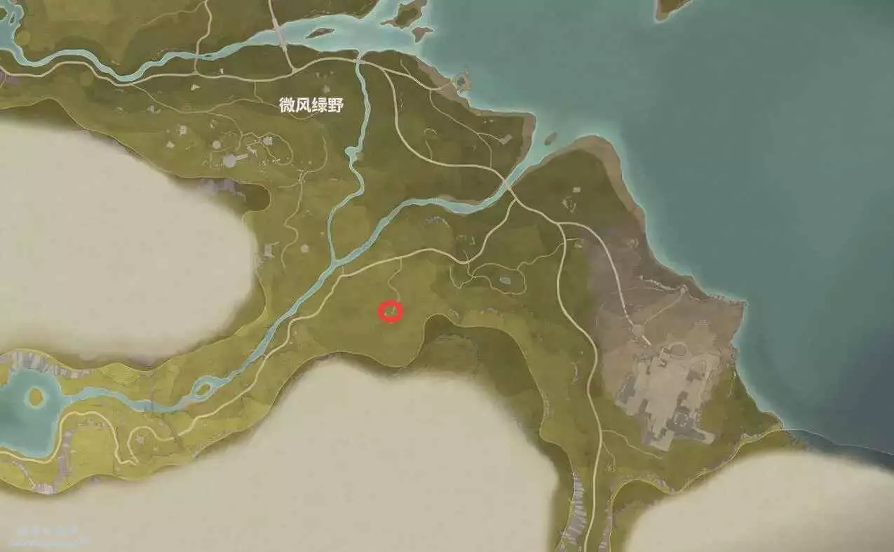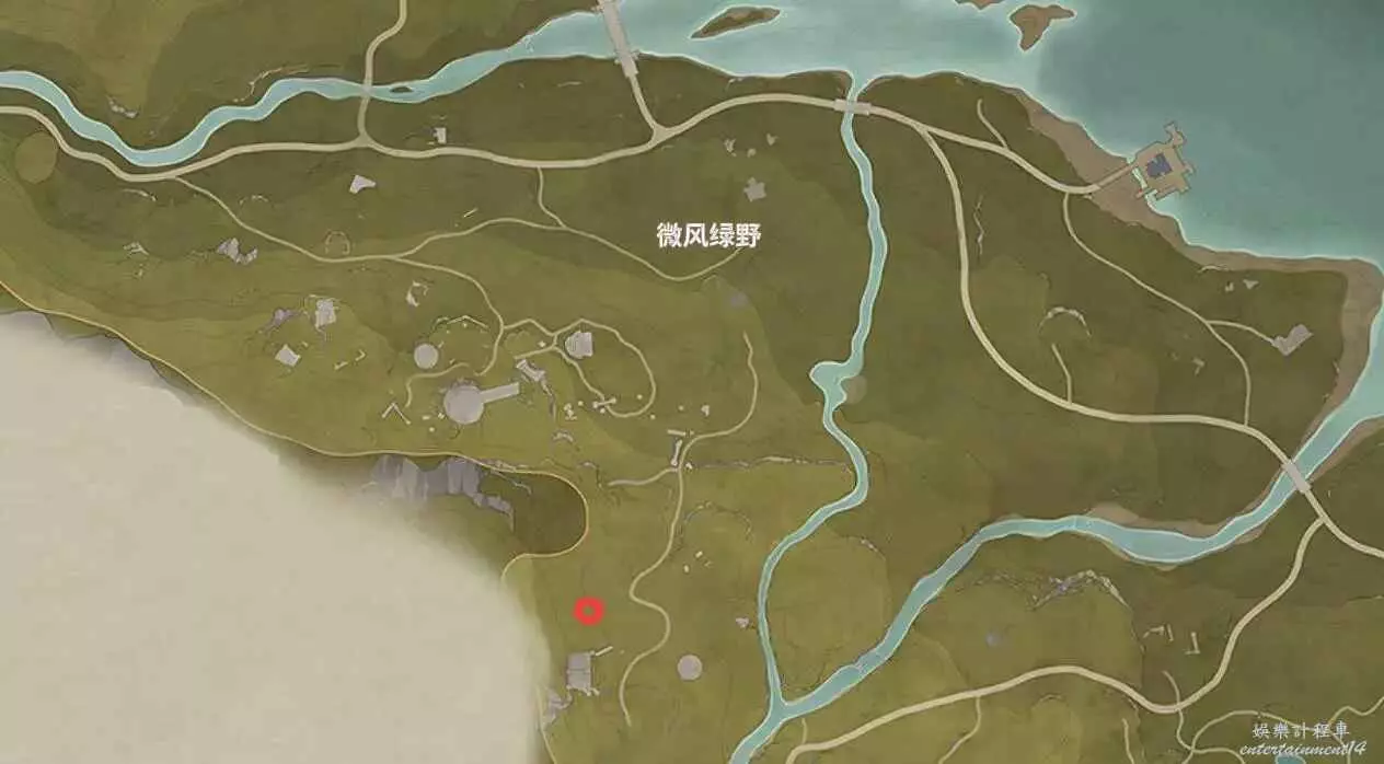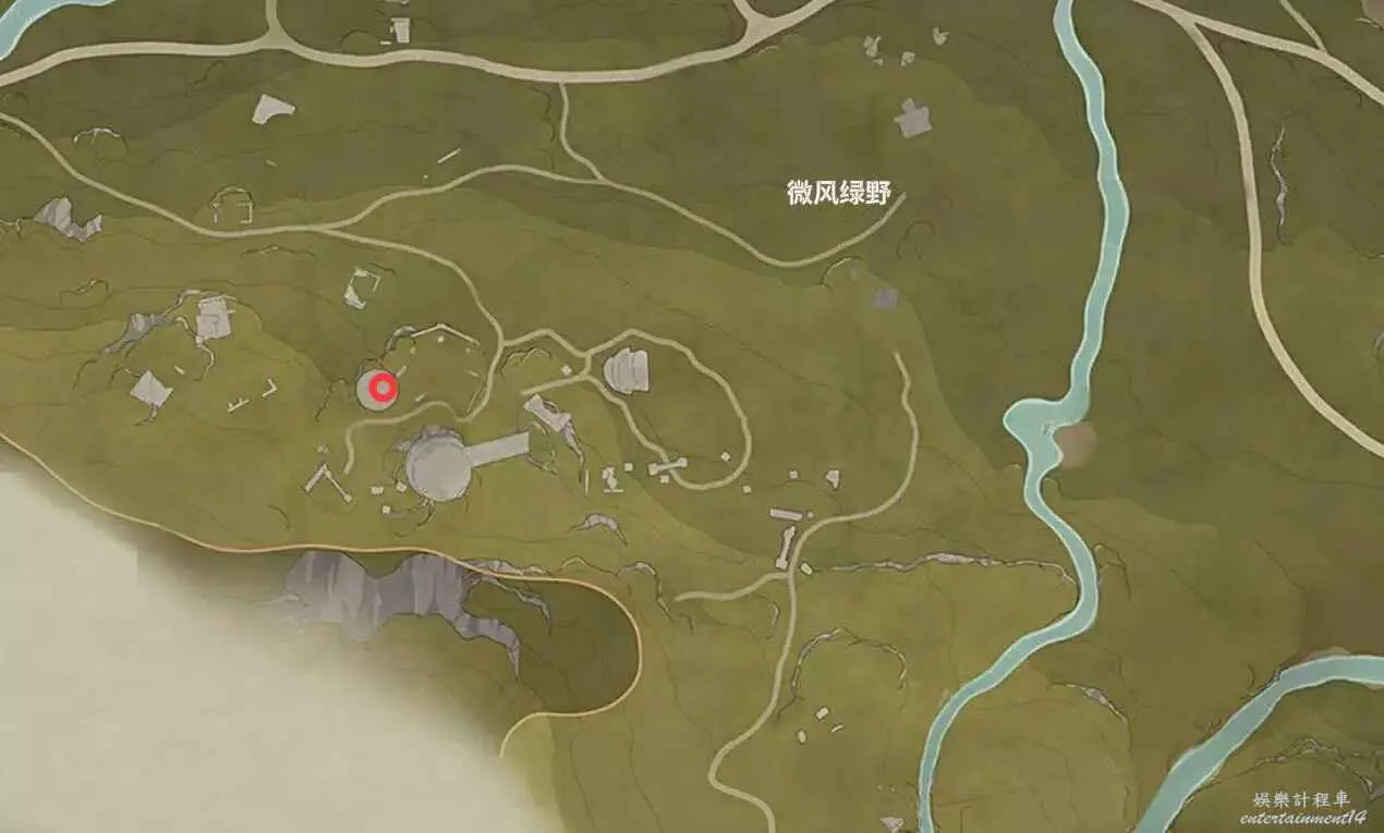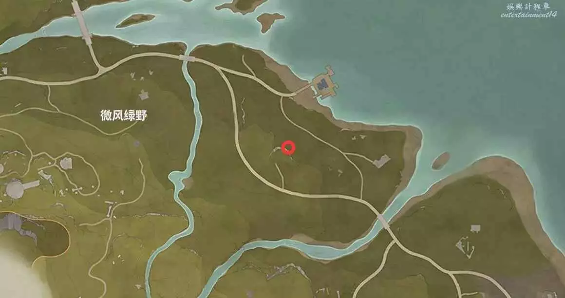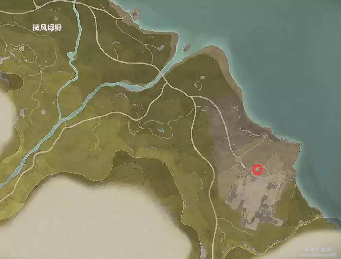 位置如下,寶箱在小山洞裡,能開出設計圖。