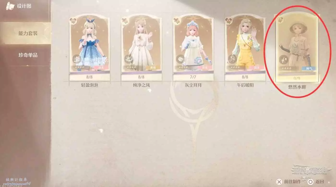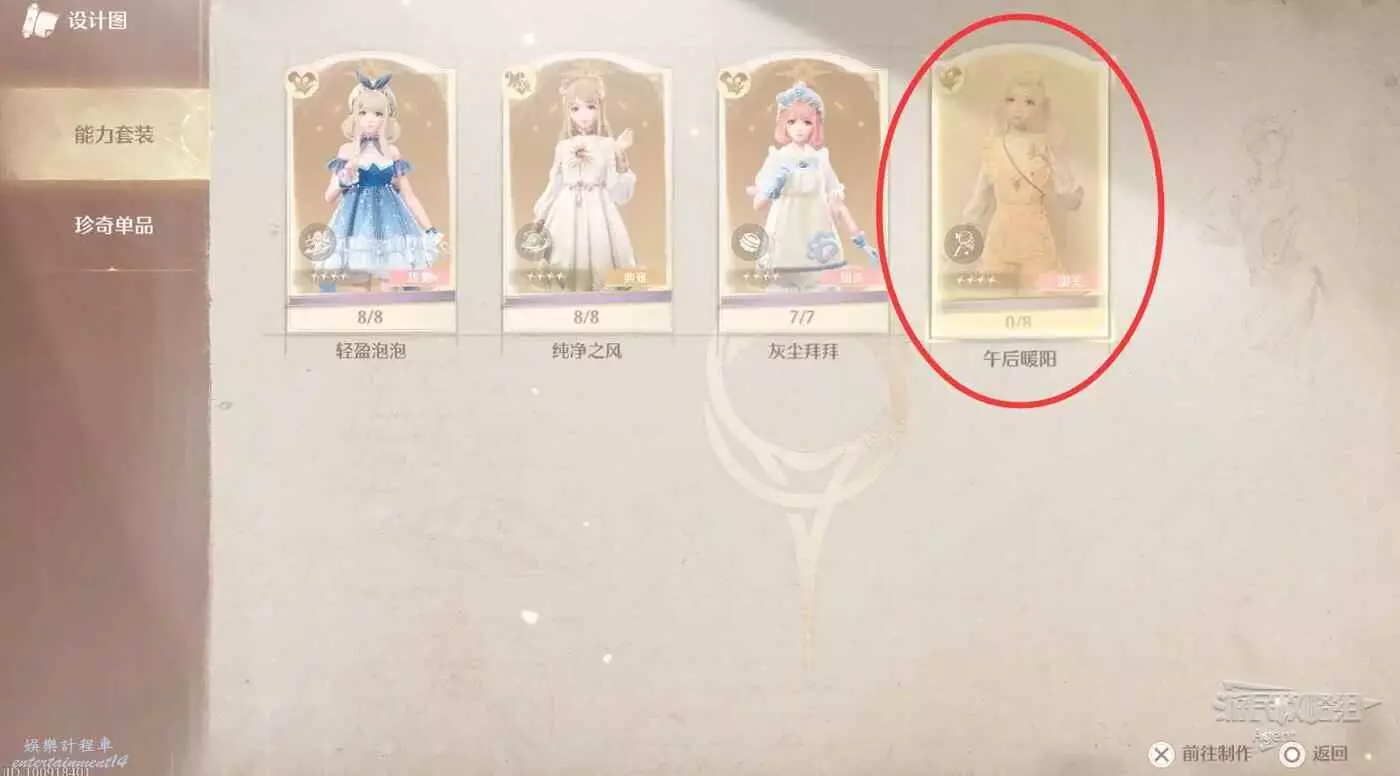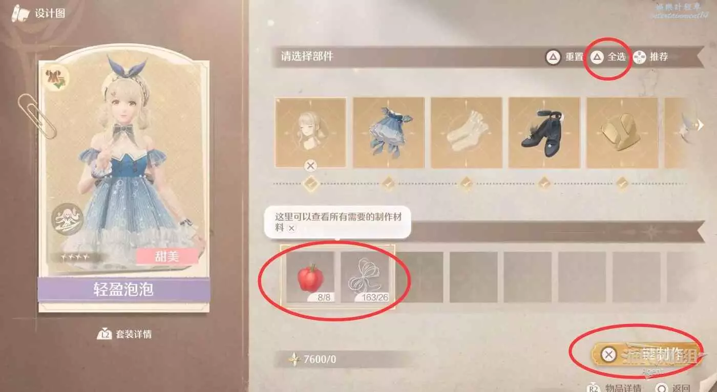 全選套裝部件,可以看到所需的製作材料。如果材料有缺的,則無法製作套裝,建議在遊戲中探索時多留意拾取路邊的各種材料。