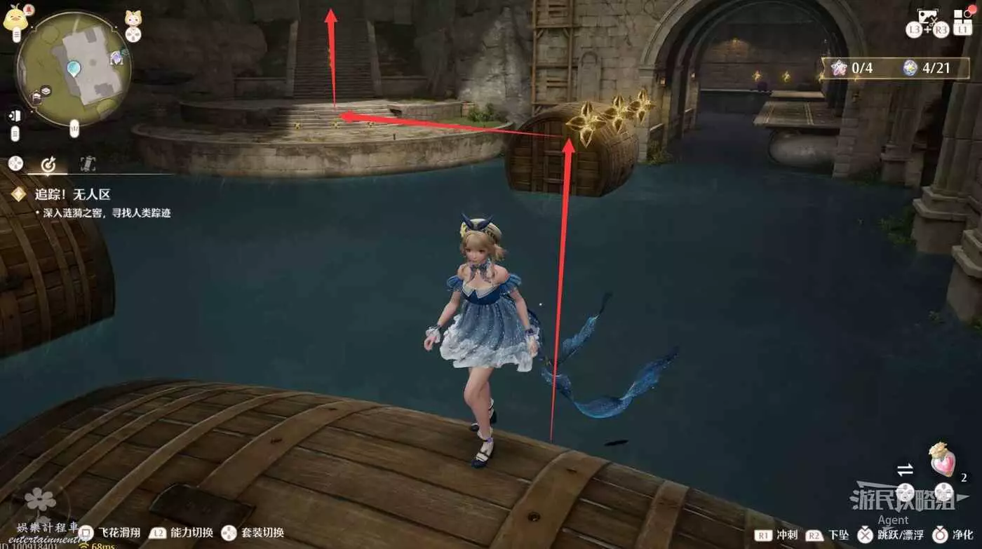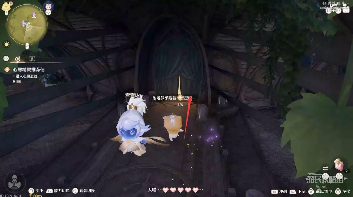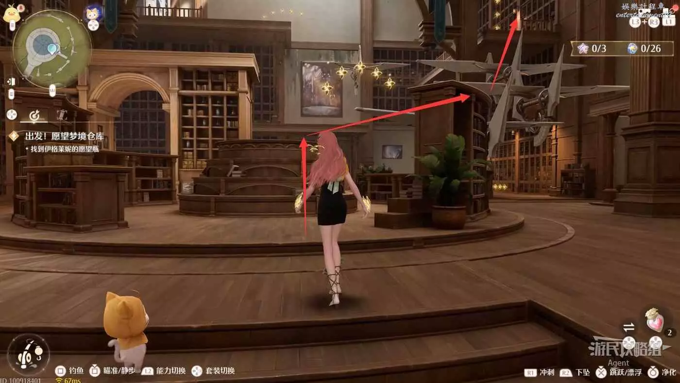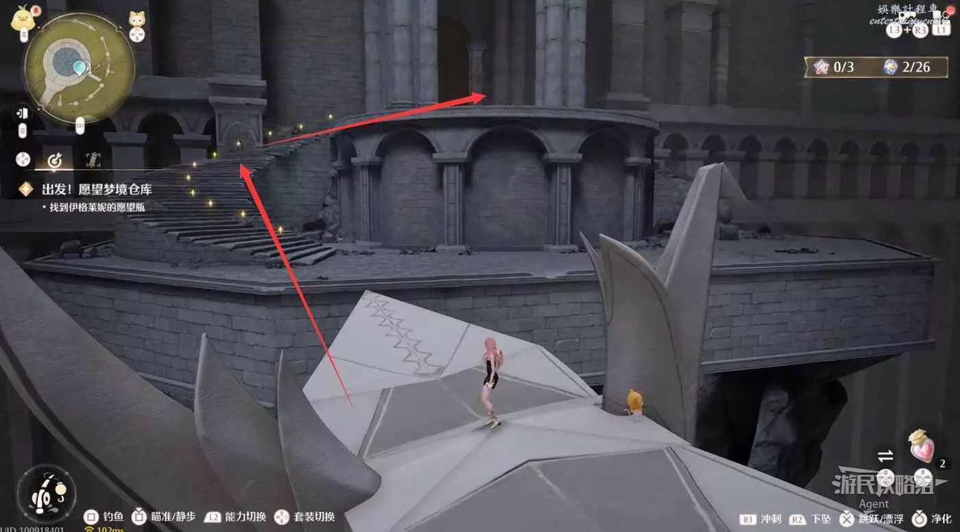 願望夢境倉庫入口在高處,利用旁邊的柱子跳上去。