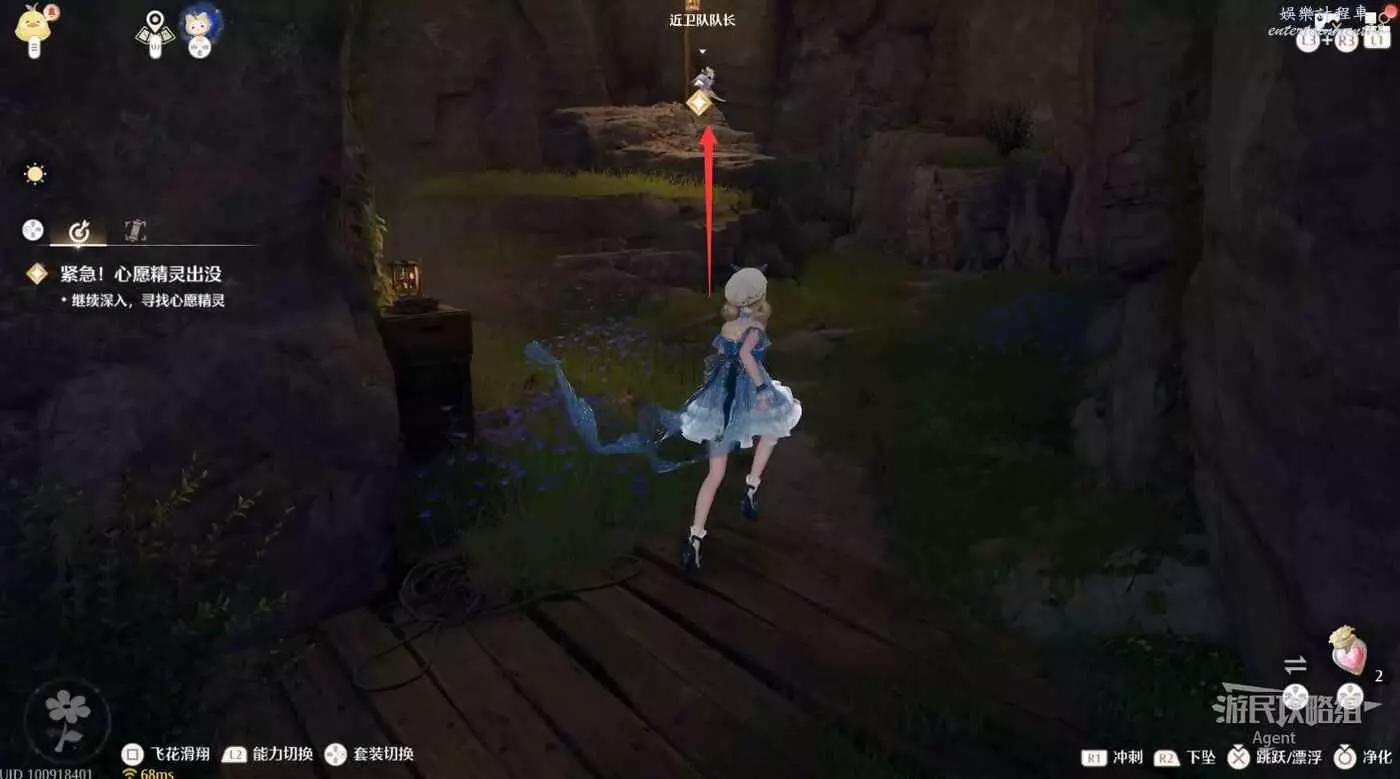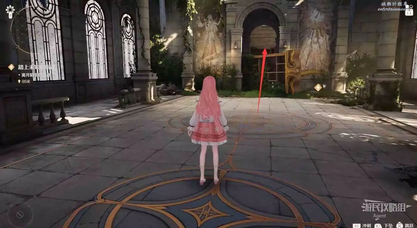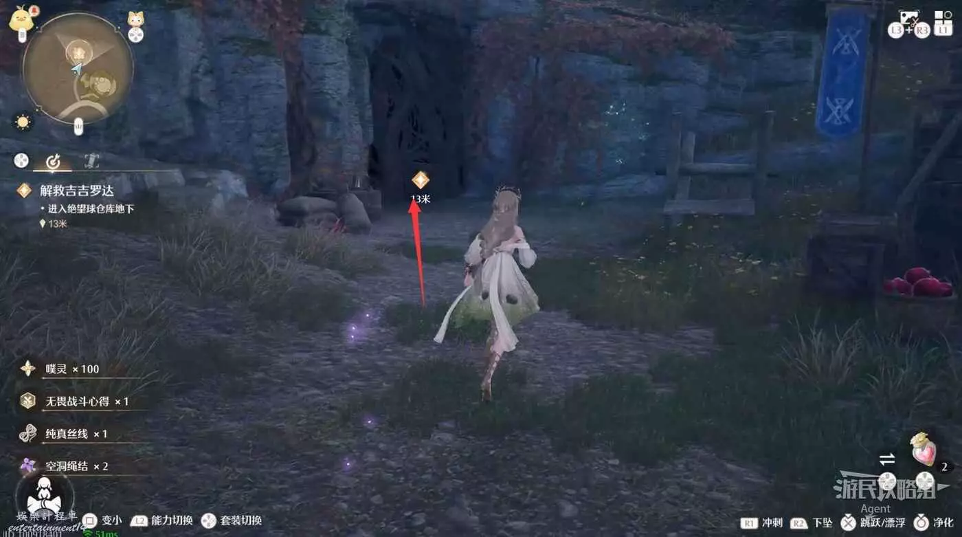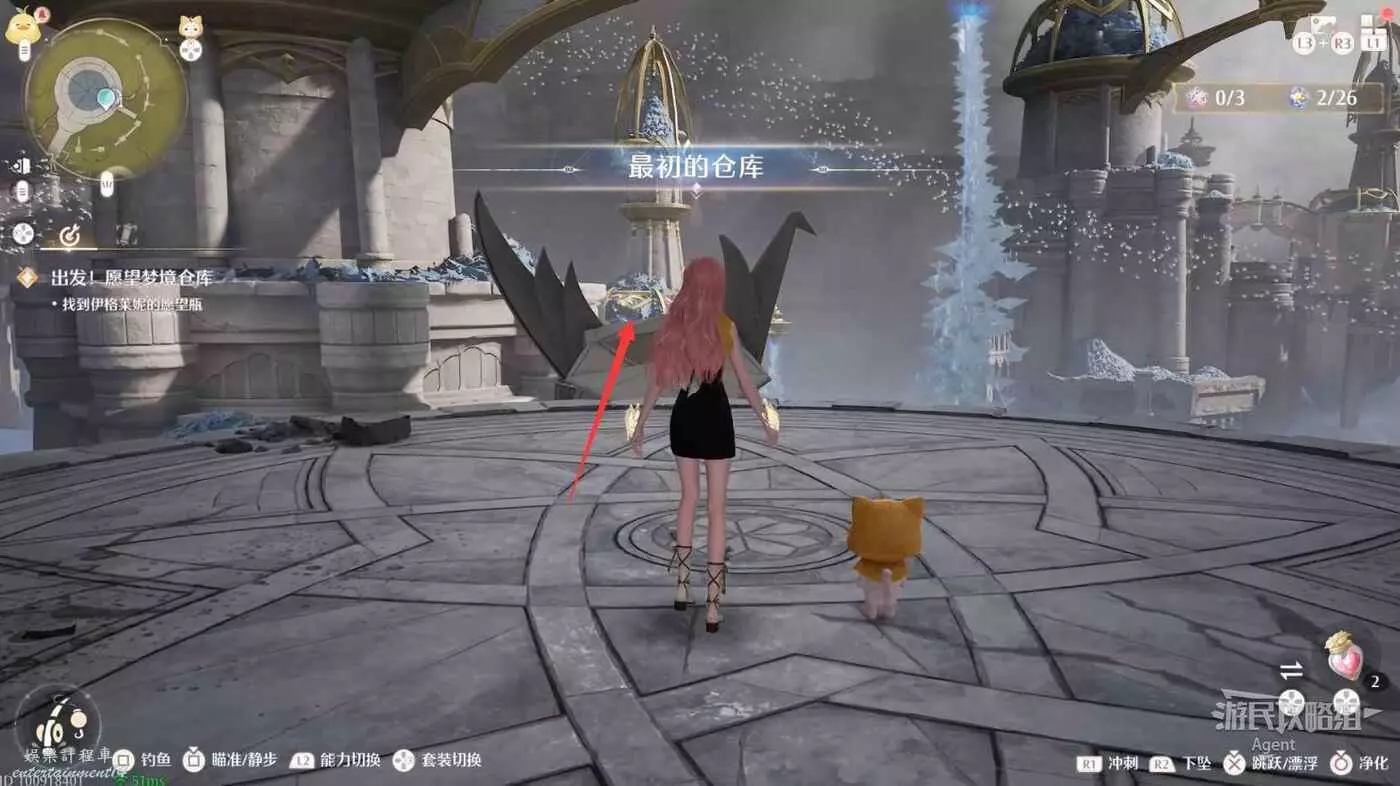願望夢境倉庫入口在高處,利用旁邊的柱子跳上去。