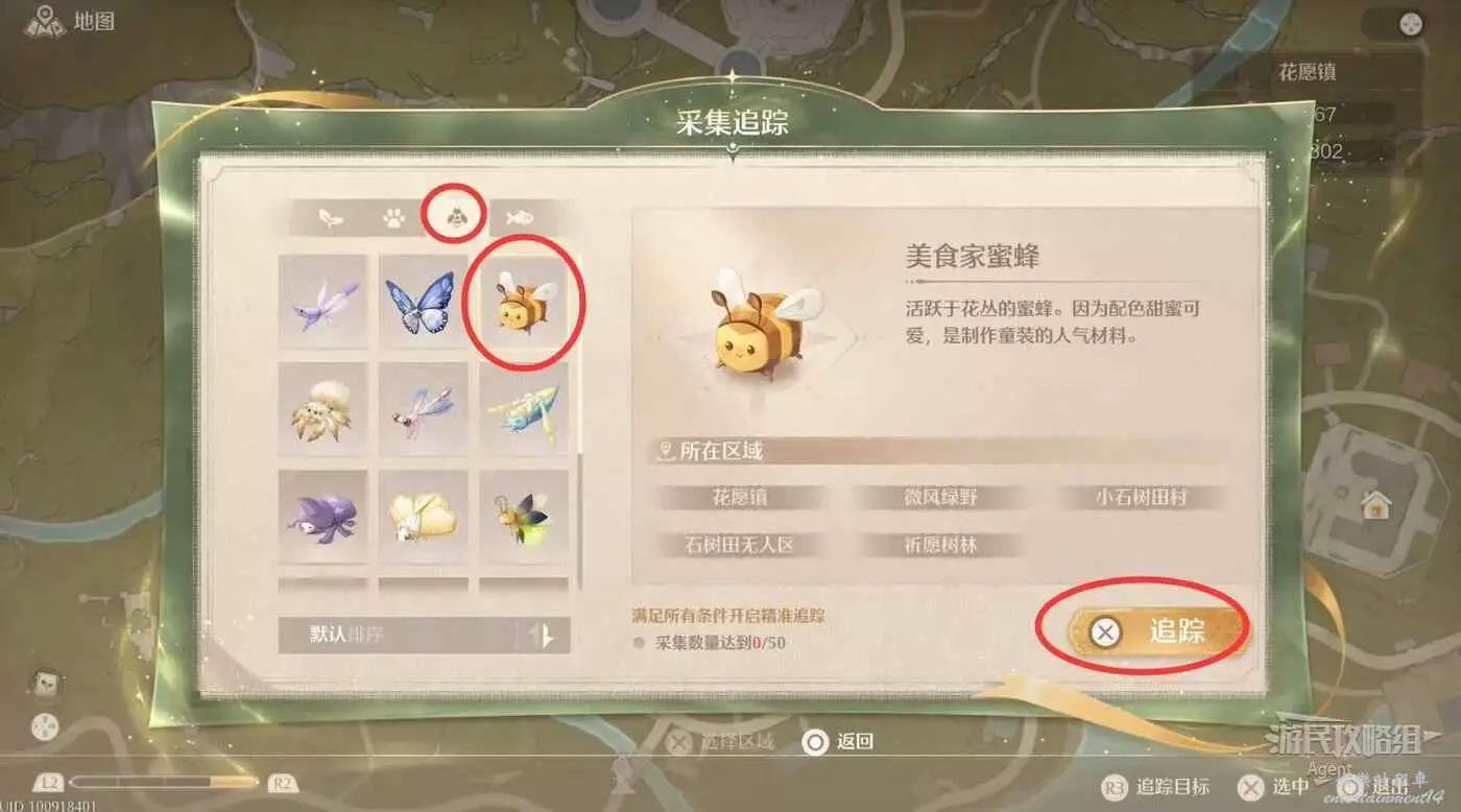 在大地圖的左下角,可使用採集追蹤功能,追蹤美食家蜜蜂的位置。