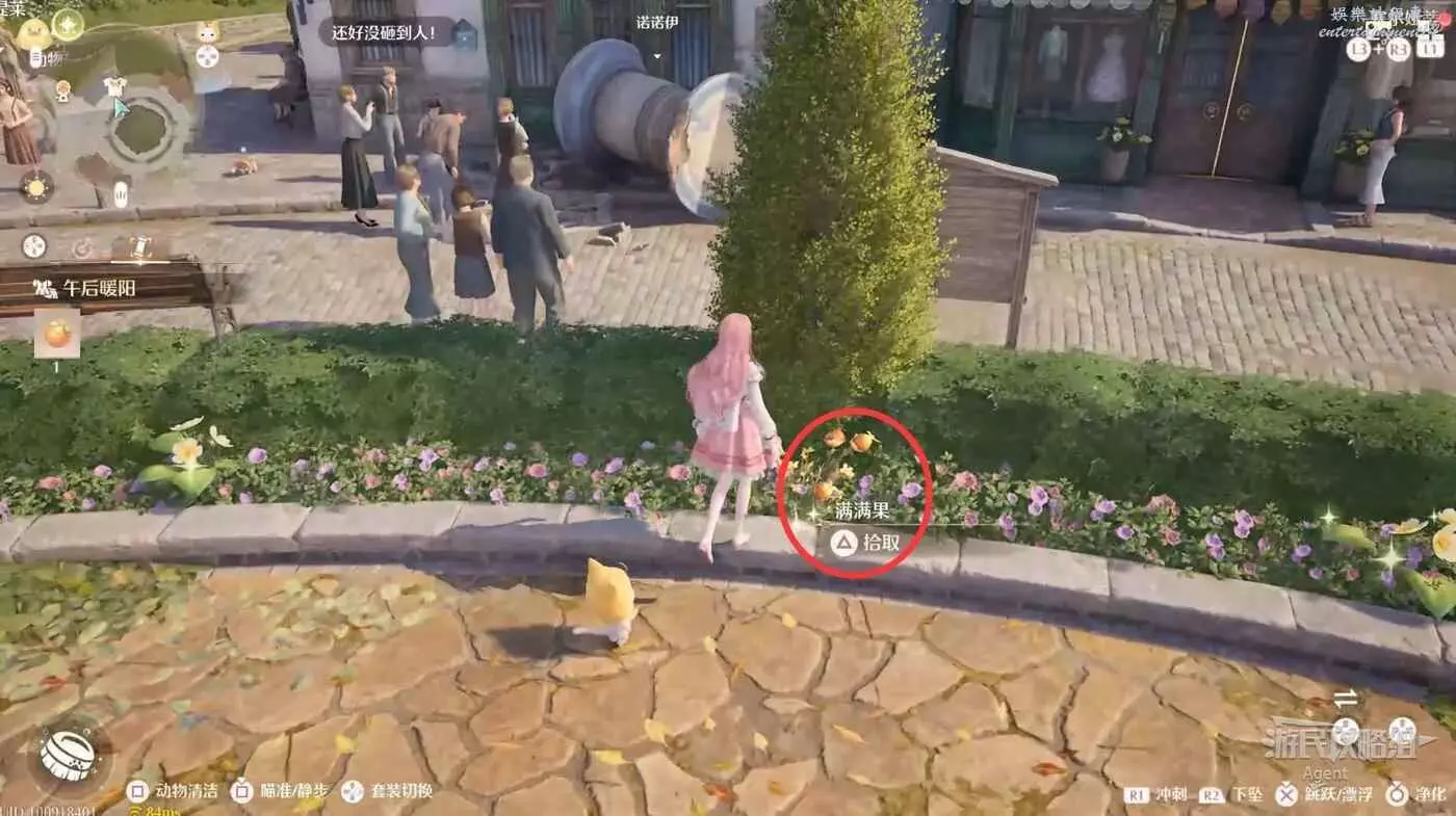注意路的兩側有材料可以收集,製作套裝需要這些材料。推果樹,果子就會掉到地上。