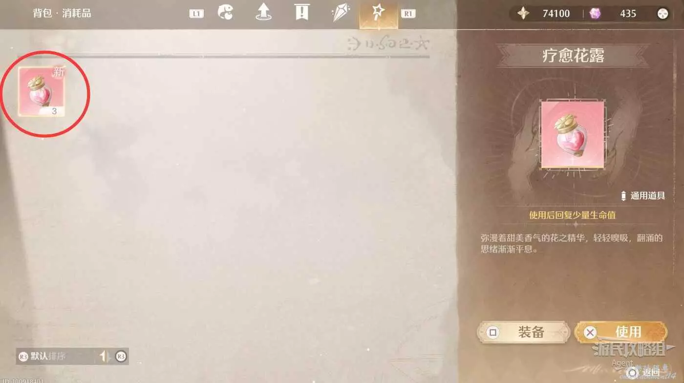 在物品欄-消耗品一欄找到療愈花露,裝備到快捷欄方便實用。