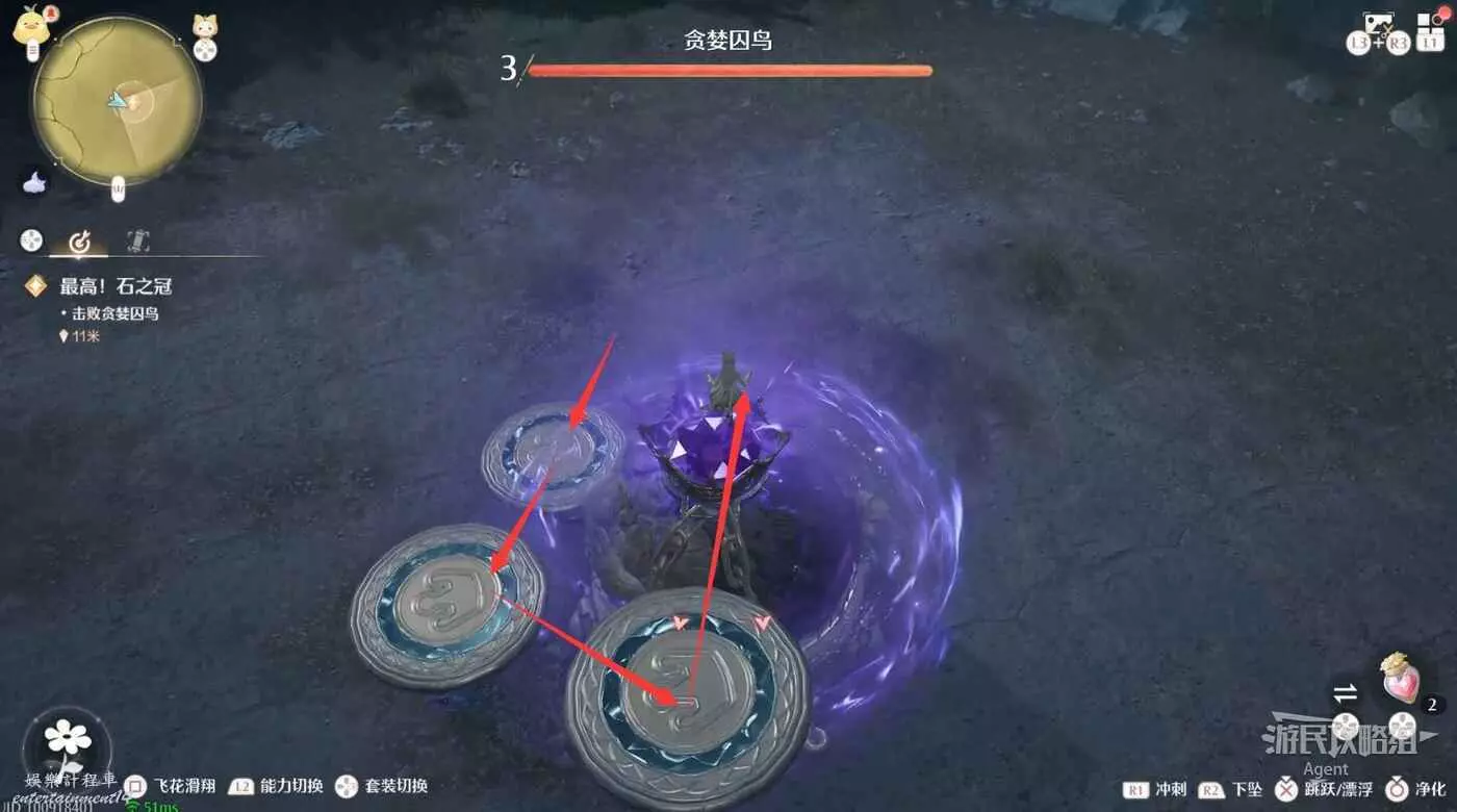 使用海豹王彈射到高處石之冠的戰場,踩著飛盤跳到BOSS頭頂,然後使用下墜能力衝擊它頭頂的弱點,就能造成傷害,如此反復三次即可。