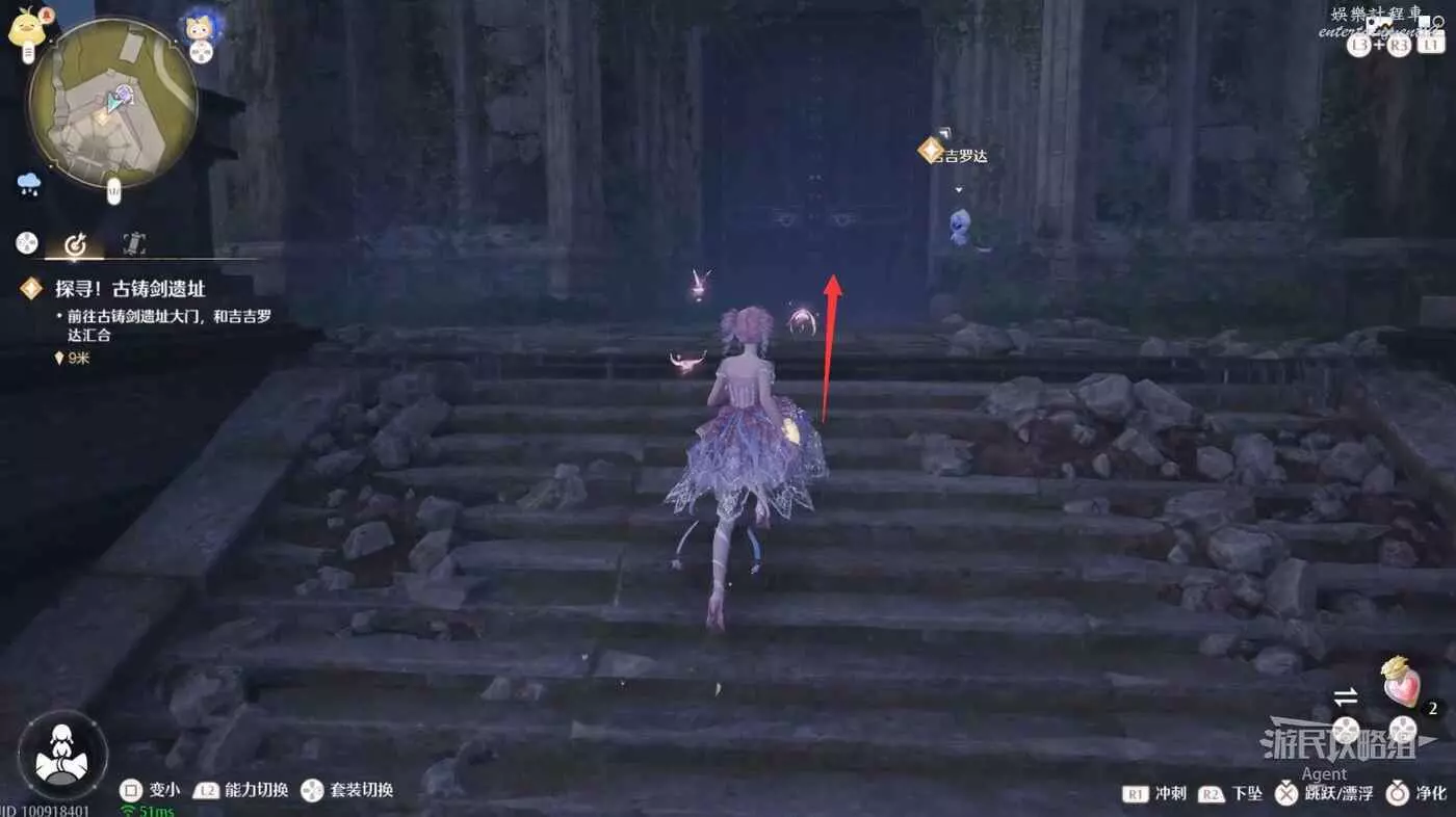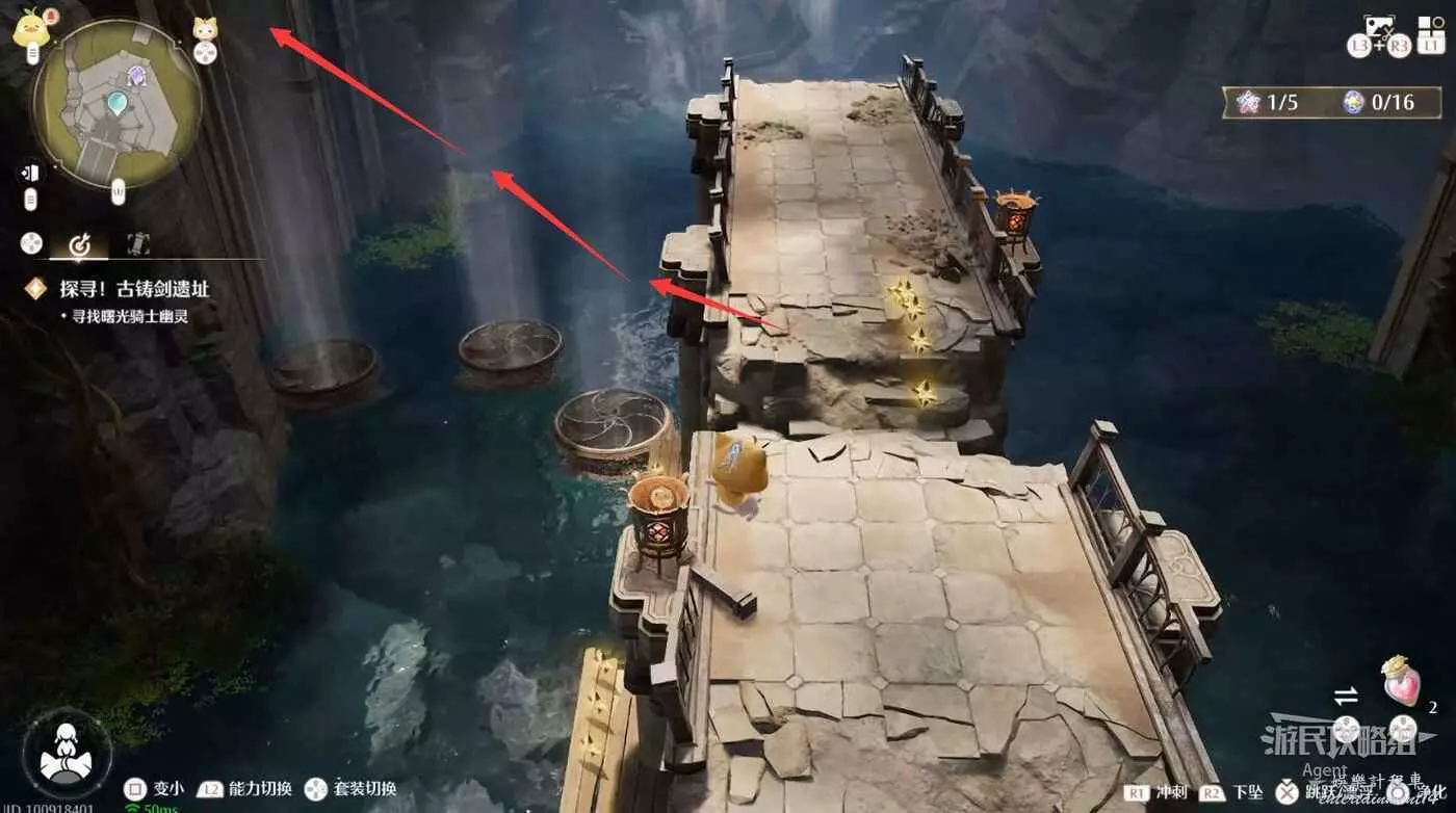 使用跳躍和漂浮能力抵達對面,進入神殿之門。