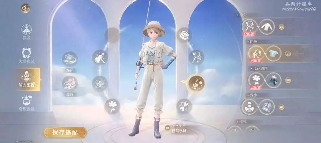 悠然水畔的能力是釣魚,穿上這件能力套裝,我們就可以在有釣魚點的河邊釣上一整天的魚,釣到的魚是很重要的材料。