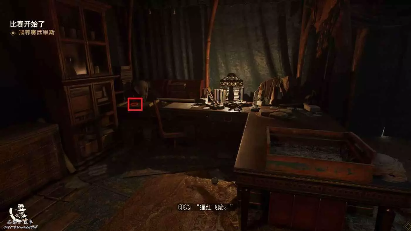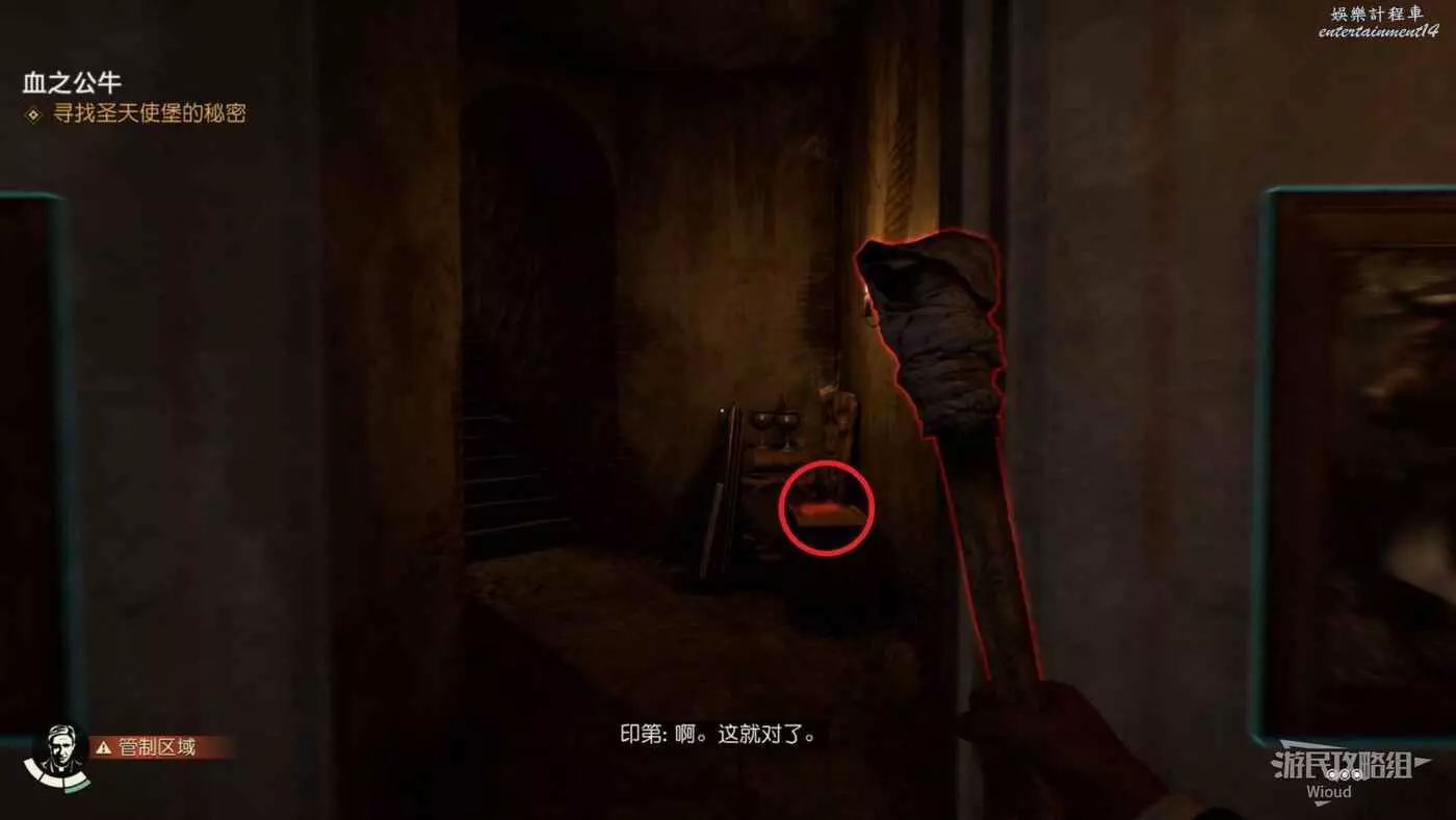 入口處的桌子上可以拿到謎題筆記【羅素的筆記】,開啟謎團【血之公牛】,隨後往房間左邊走到盡頭。