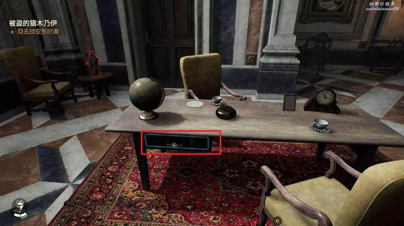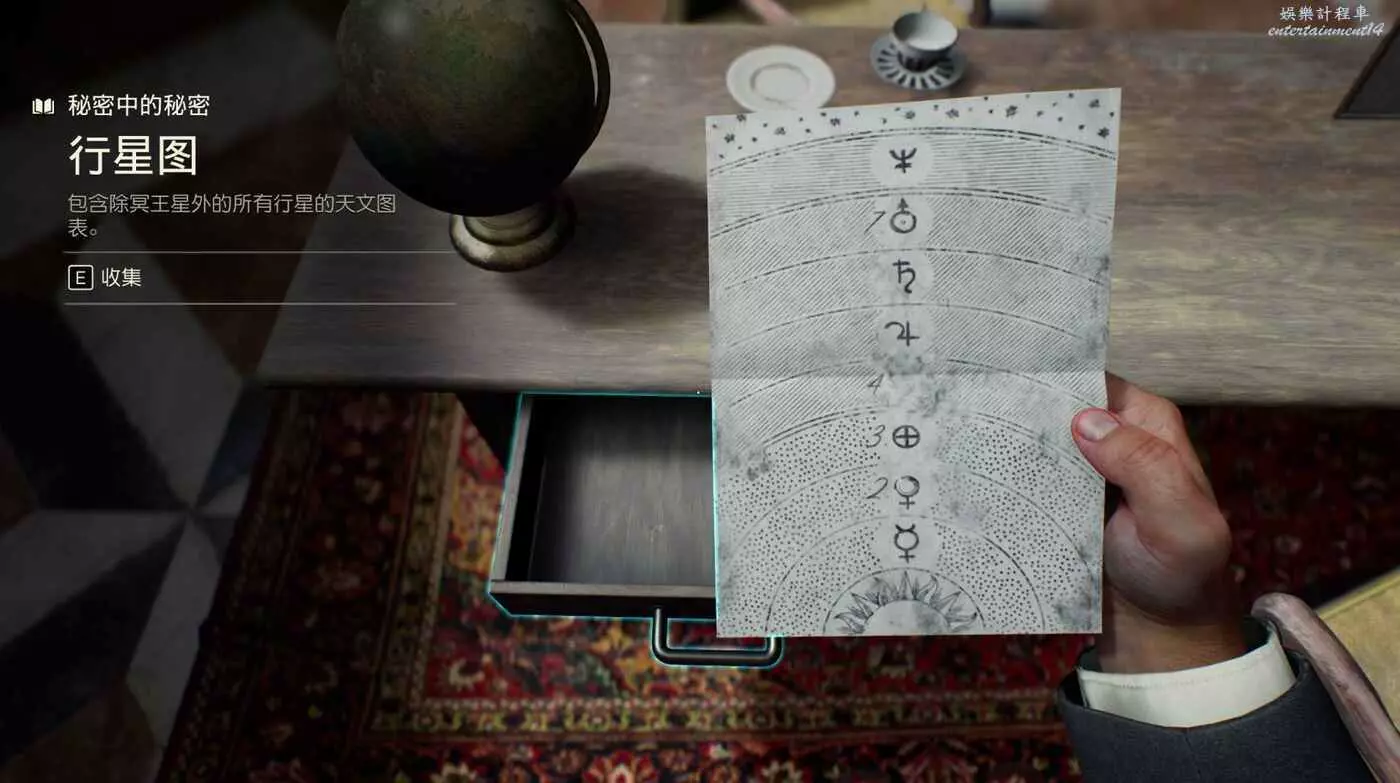 倆雕像中間桌子有一個比較隱蔽的抽屜,打開可以獲得謎題筆記【行星圖】。