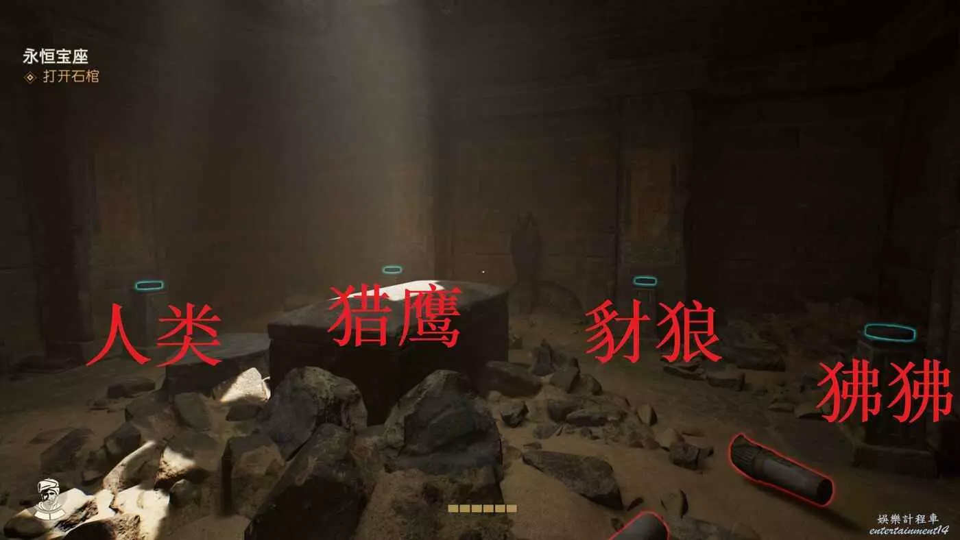 回到墓穴房間,此時我們已經拿到三個罐子,獵鷹罐就在這個房間裡。