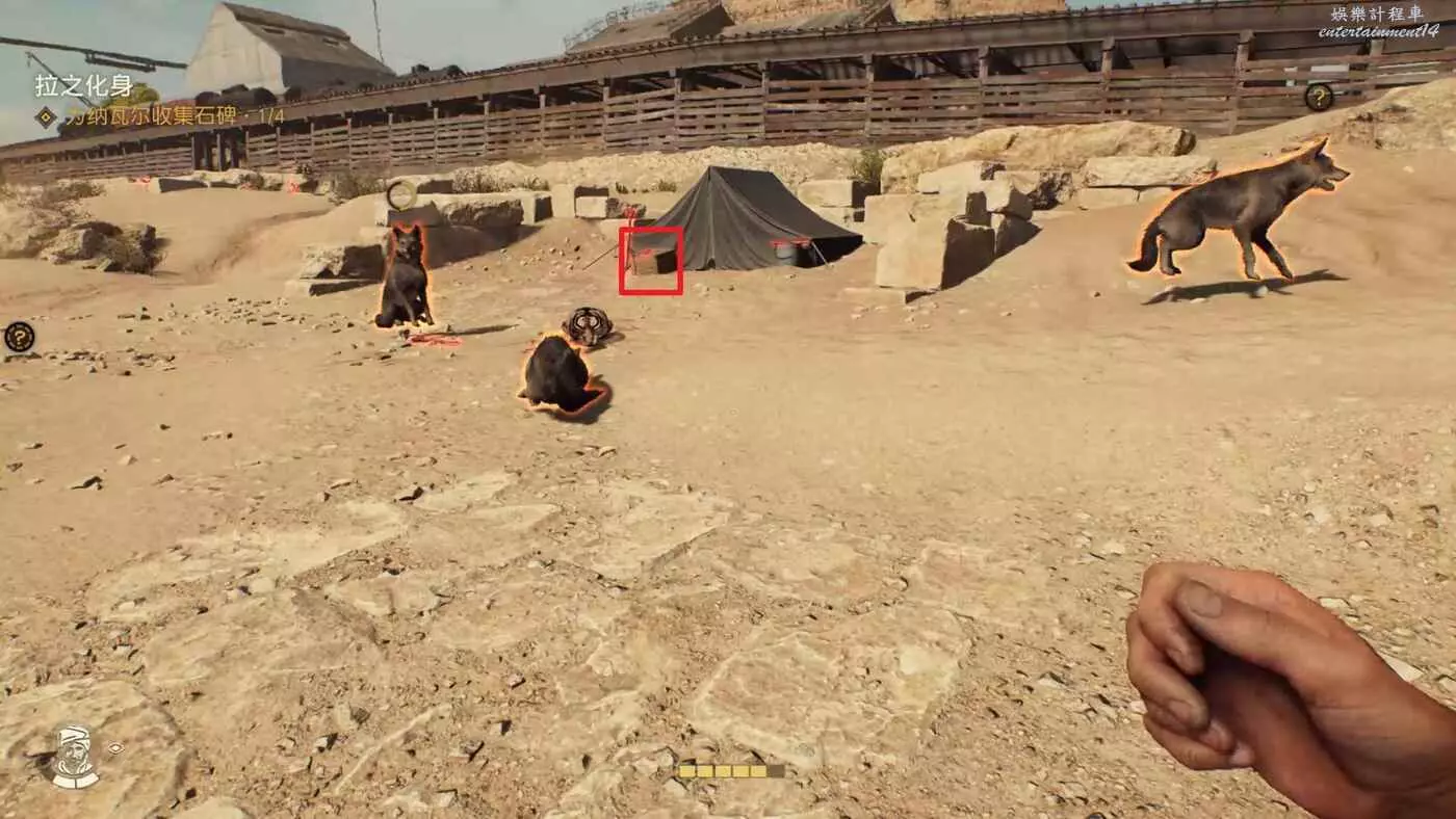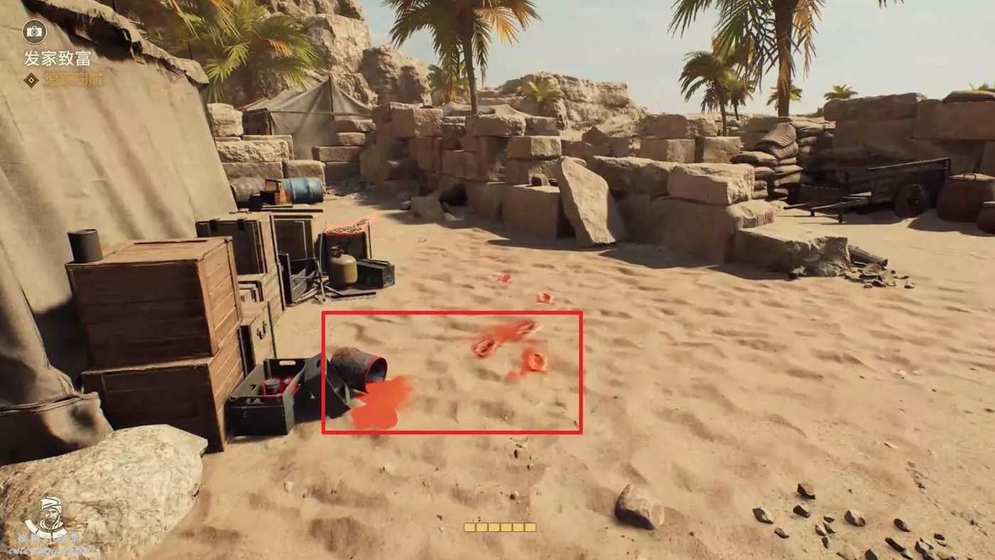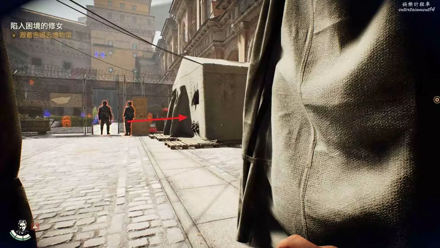 先直走一段,進入左邊第二個帳篷,裡面有兩個敵人,悄悄解決掉。