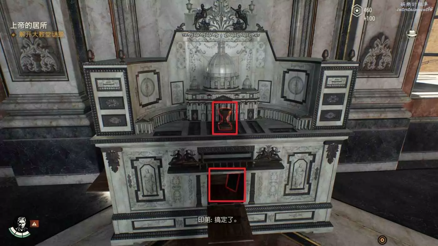 將聖杯放到機關上面完成謎團【上帝的居所】,拾取下面的物品獲得【梵蒂岡文物】。