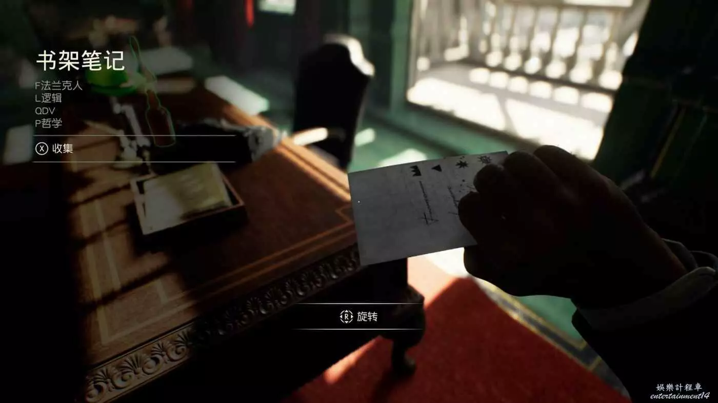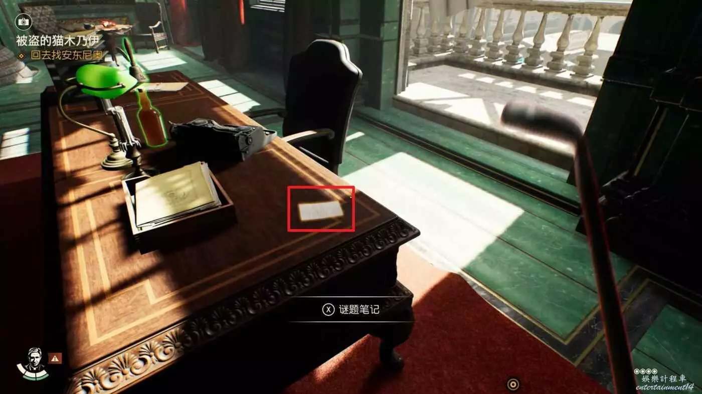 陽臺旁的桌子上可以獲得謎題筆記【書架筆記】,收集開啟新謎團【花園裡的蛇】。