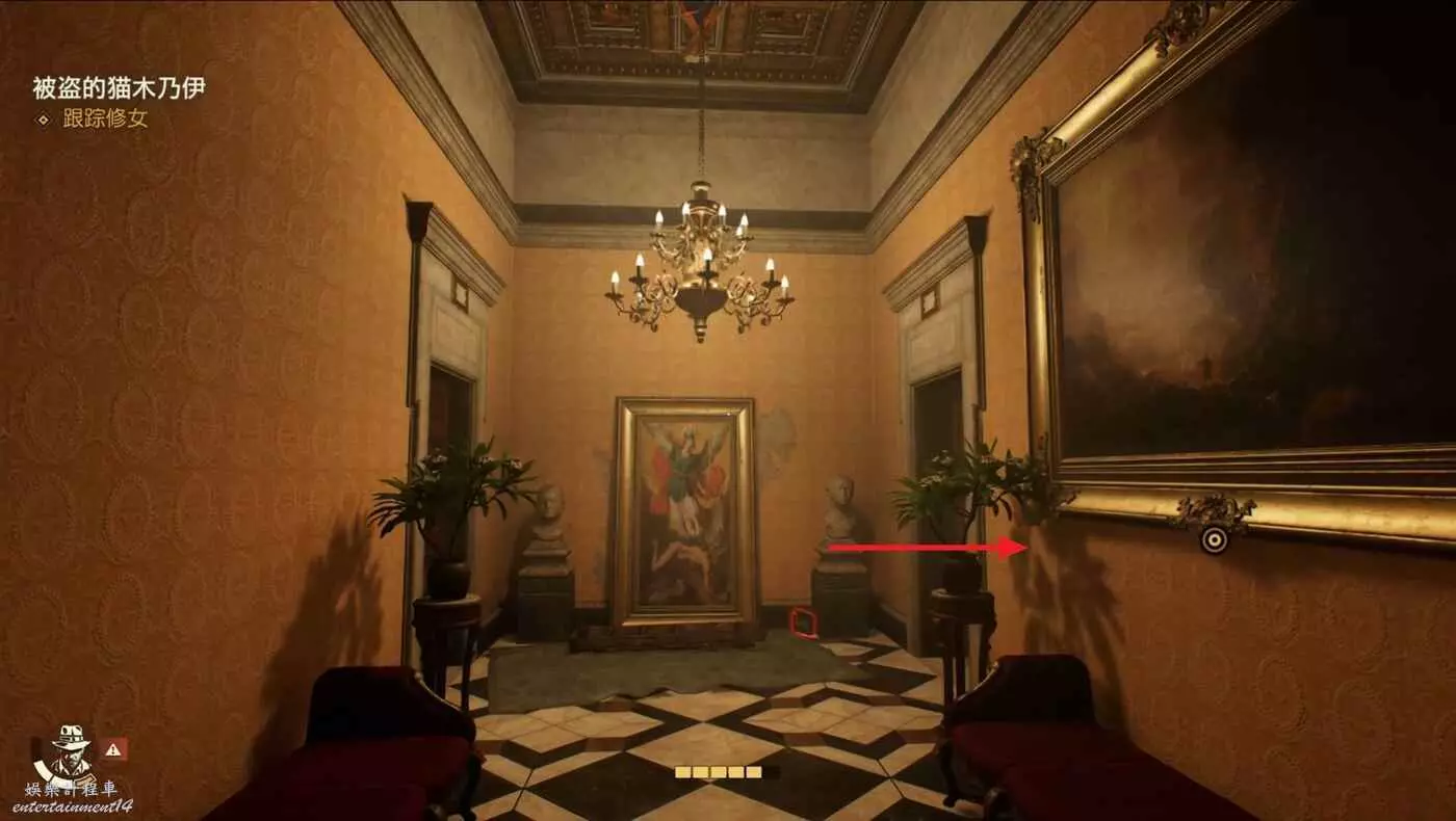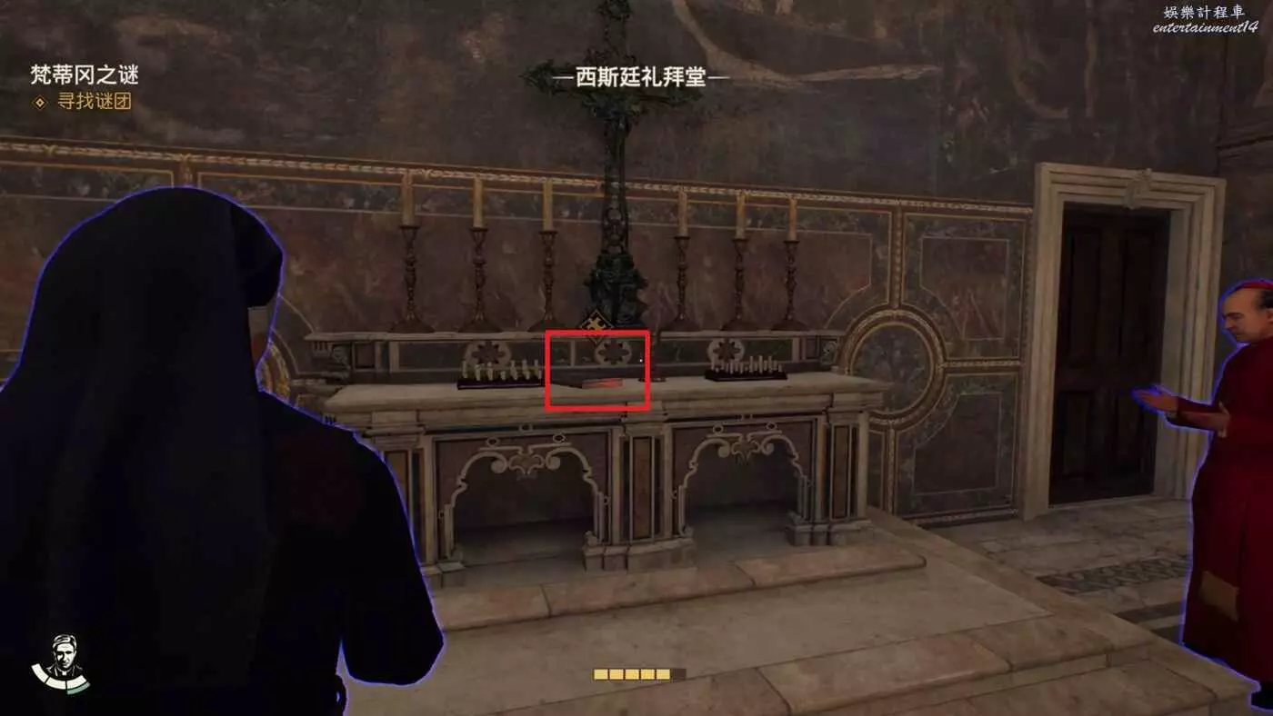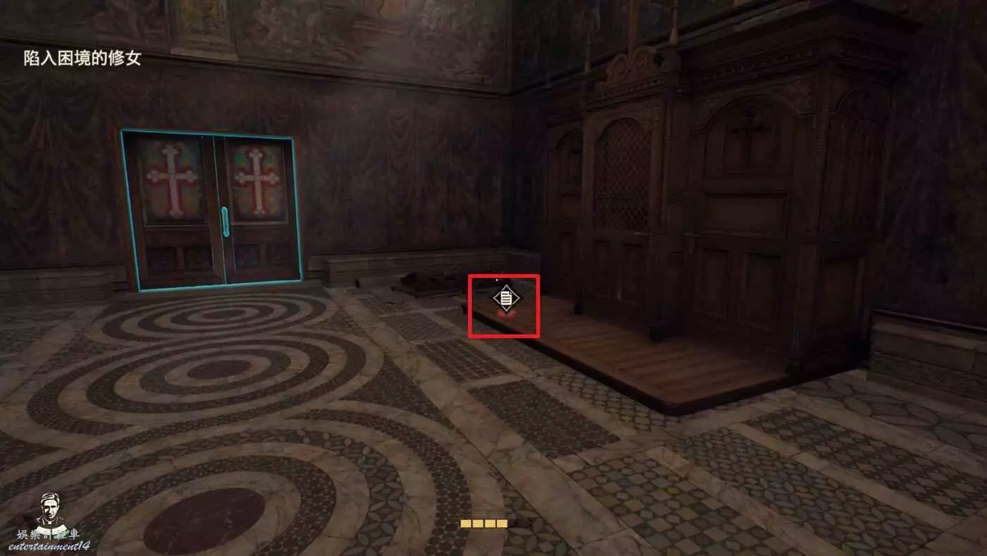 完成陷入困境的修女支線後,前往西斯廷禮拜堂,在中間的大十字架處的桌子上可以拿到筆記【吉娜的要求】並接取謎團【麻煩的跡象】。
