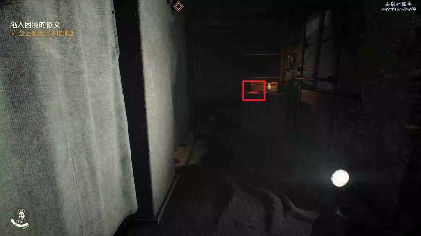 這個謎團的觸發地點位於【上帝的居所】房間上層,從【上帝的居所】房間出來,繼續爬外面的樓梯到頂層,去樓梯上方右側的房間可以拿到一些補給。