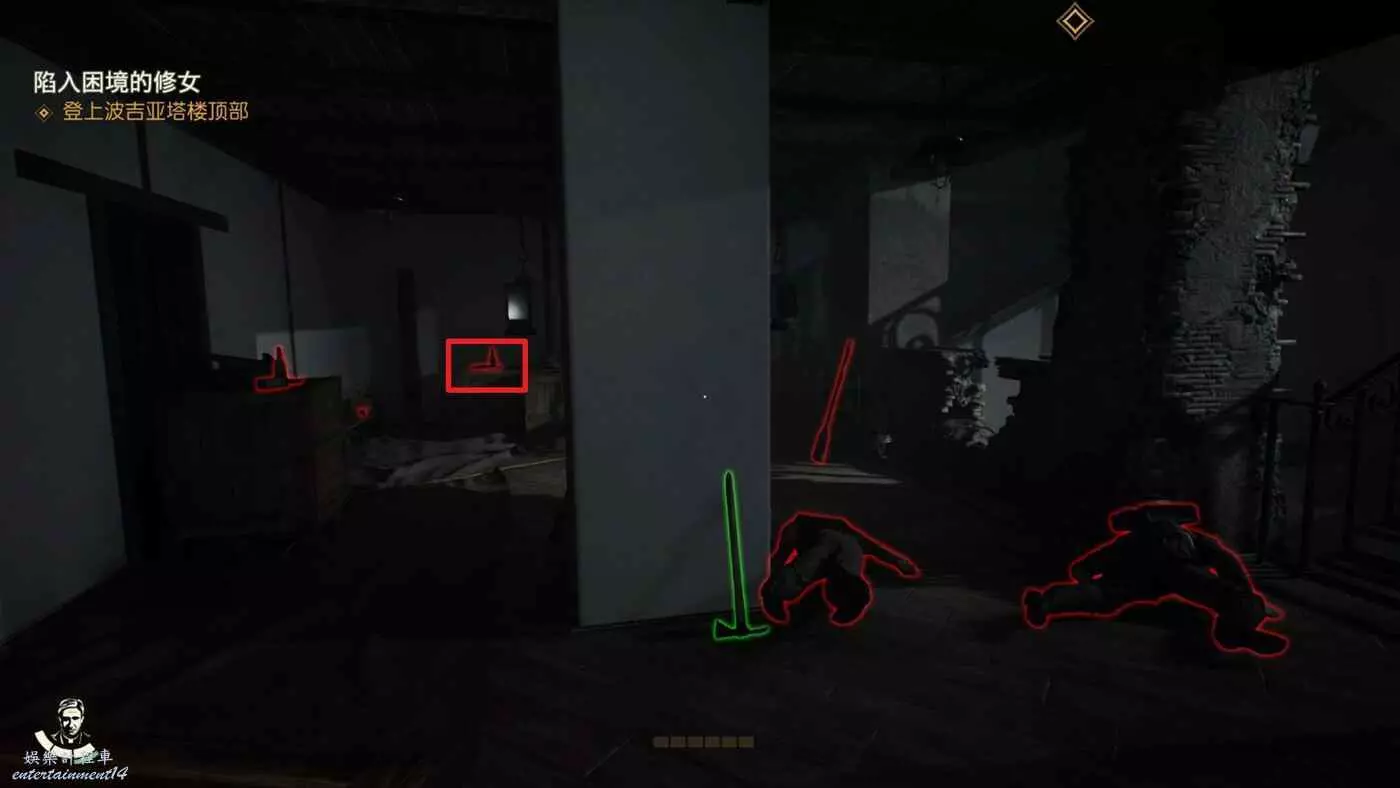 爬到挖掘現場後看到一個可疑的修女進入了這個區域入口左邊無法打開的門內。