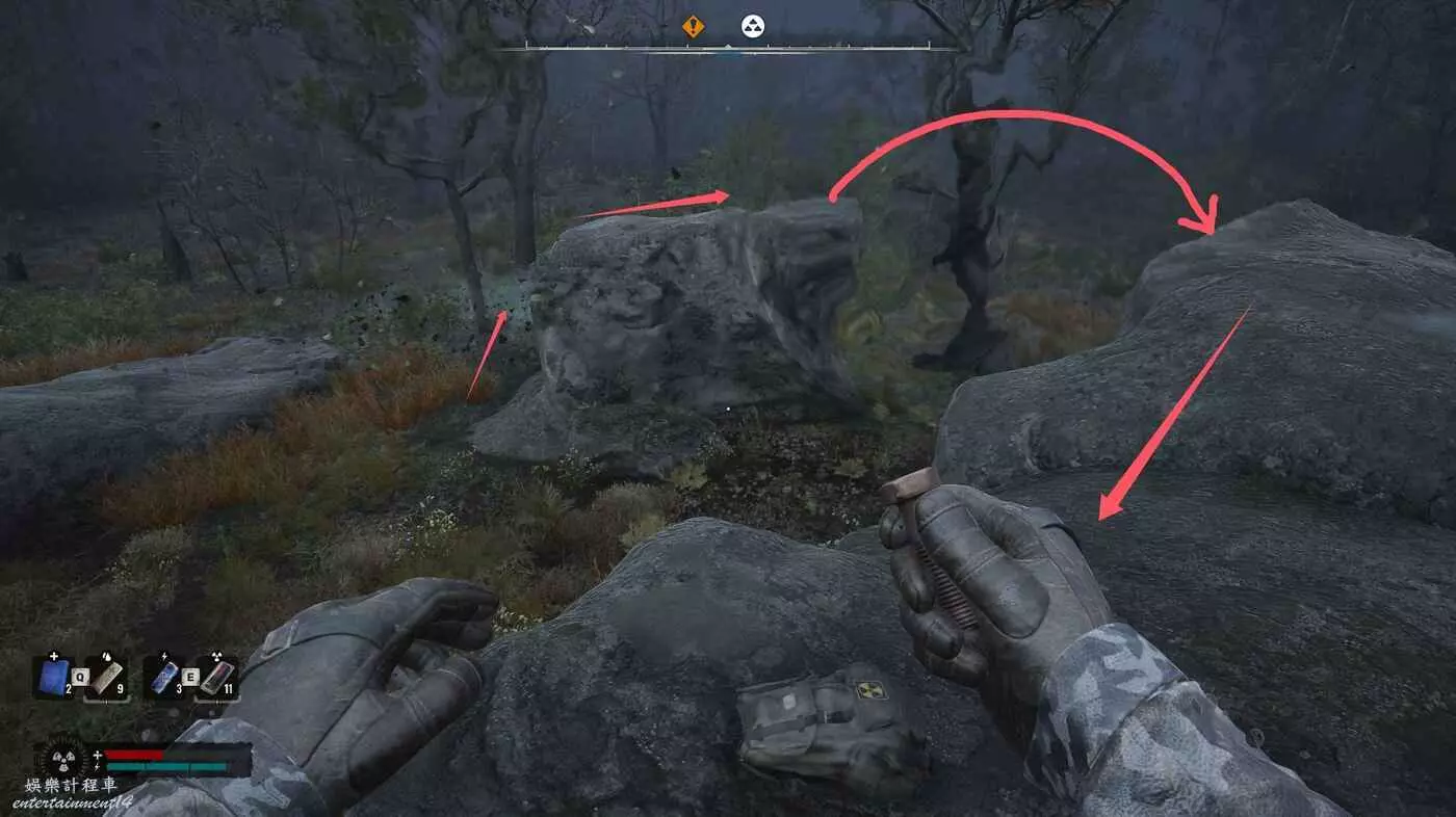 要先來到下面,然後穿過特異點,找到這個山洞不要進去,從這往上爬,找到另一個洞,然後直接跳過去