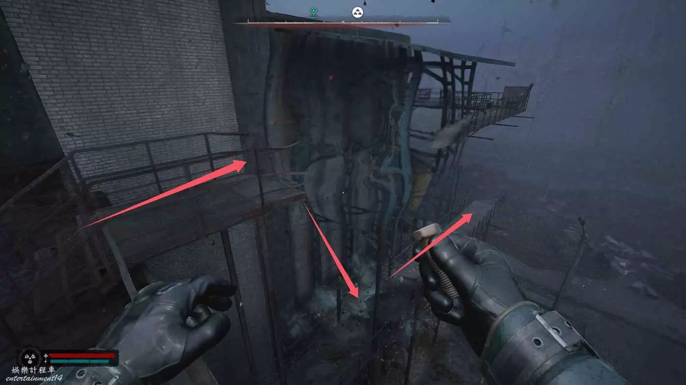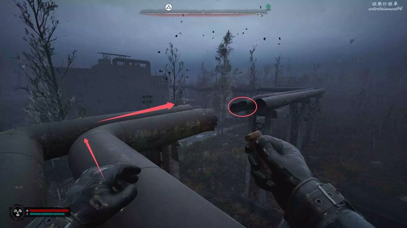 從梯子上樓,然後一路跑酷,管道中間的縫隙不會掉下去,建議提前存檔。一定要多留一點衝刺距離,否則跳不了多遠。
