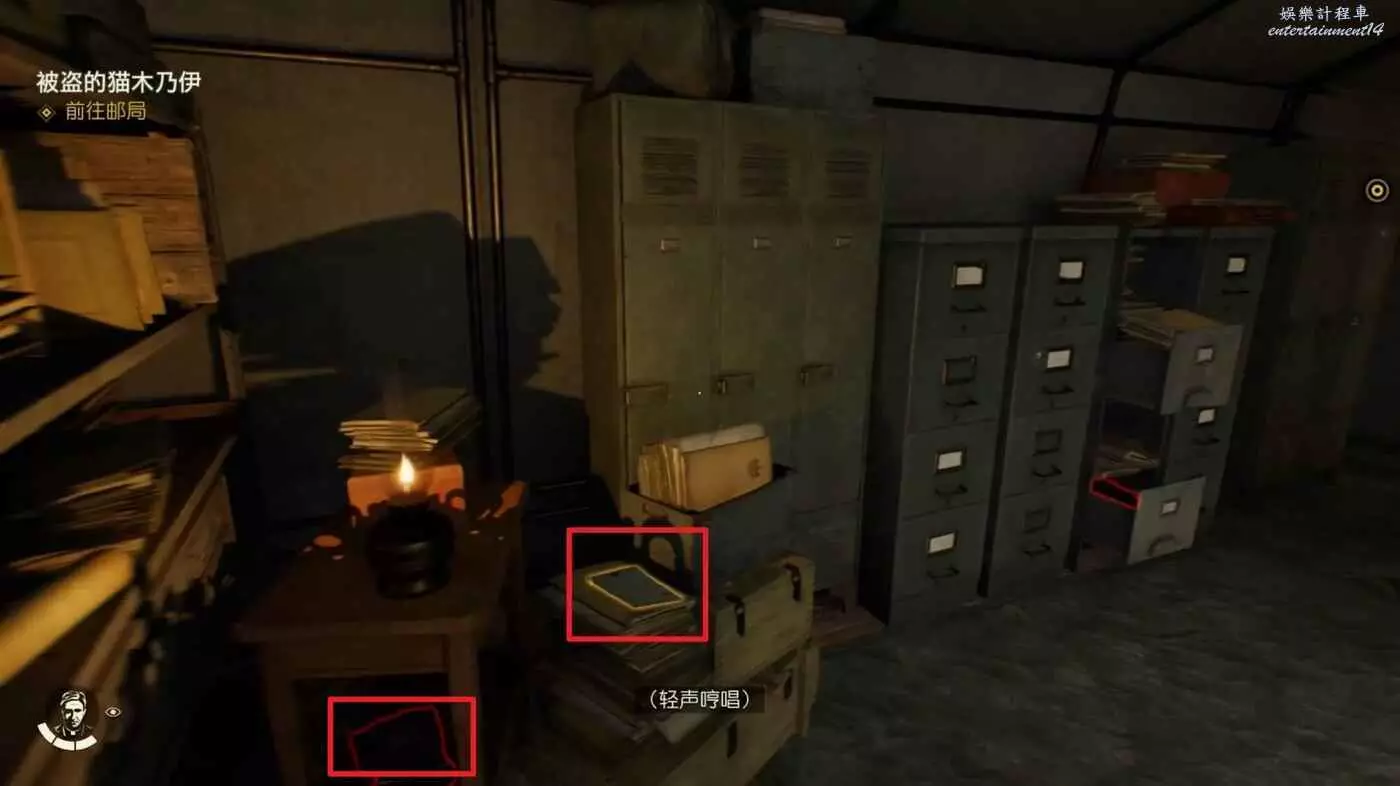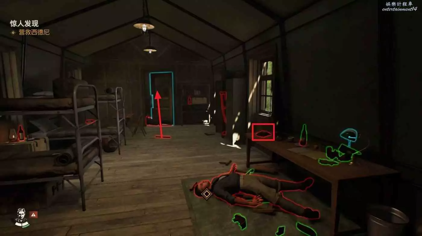 帳篷入口左側有一個筆記能拿,拾取獲得【盜竊報告】並開啟實地考察【驚人發現】,左側櫃子下面還有錢拿,這裡的錢算是盜竊,需要注意不要被NPC看到。