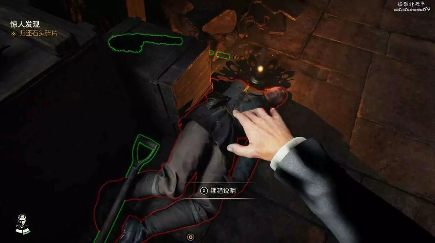 先拾取【石頭碎片】觸發劇情,擊敗出現的敵人,從敵人身上拾取筆記【鎖箱說明】。