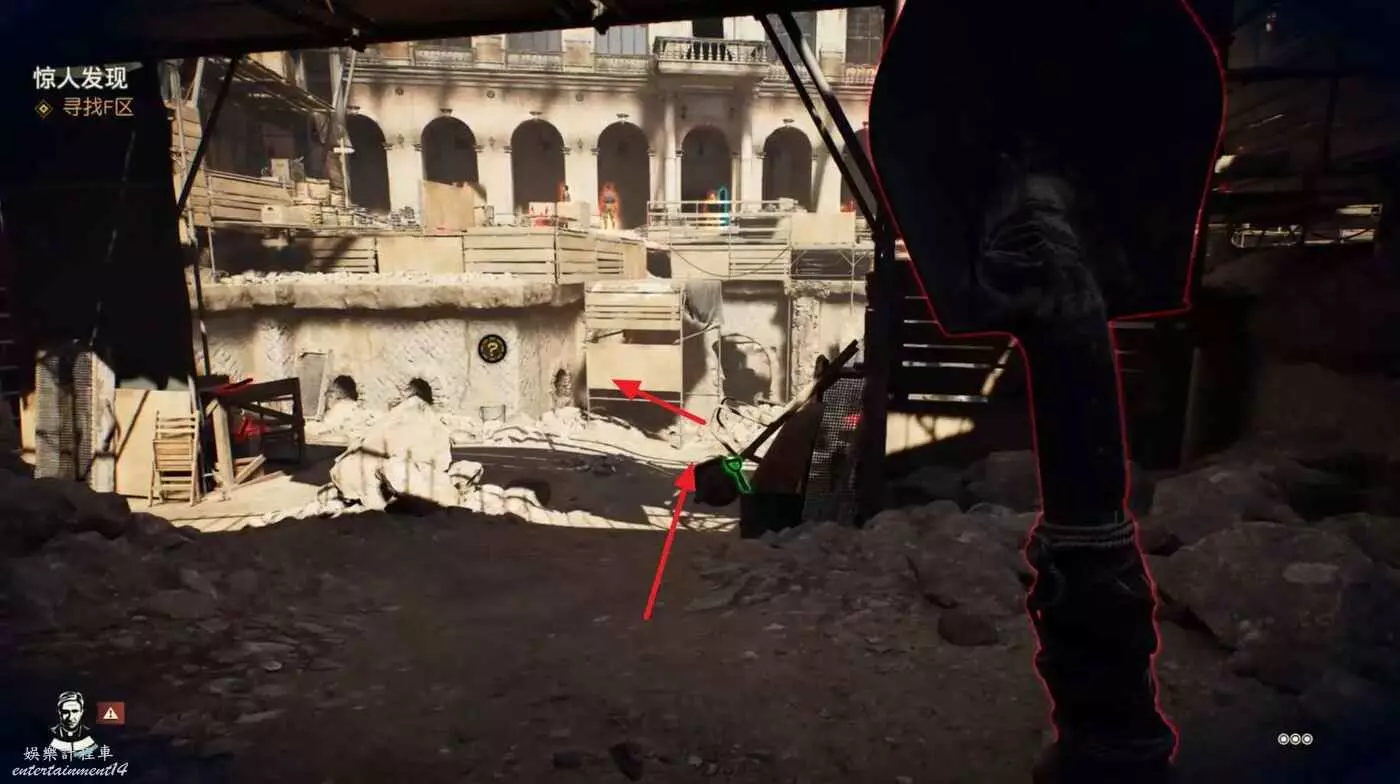 爬到挖掘現場後看到一個可疑的修女進入了這個區域入口左邊無法打開的門內。