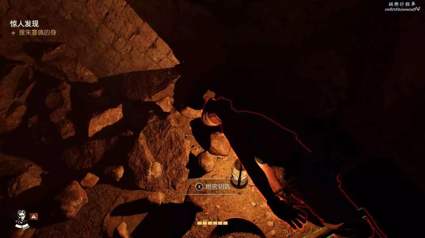 劇情結束我們與吉娜一塊掉進了下方區域,周圍有很多蠍子,先與角落的鎖鏈互動開啟左側的大門,進入裡面房間拿到一個火把。