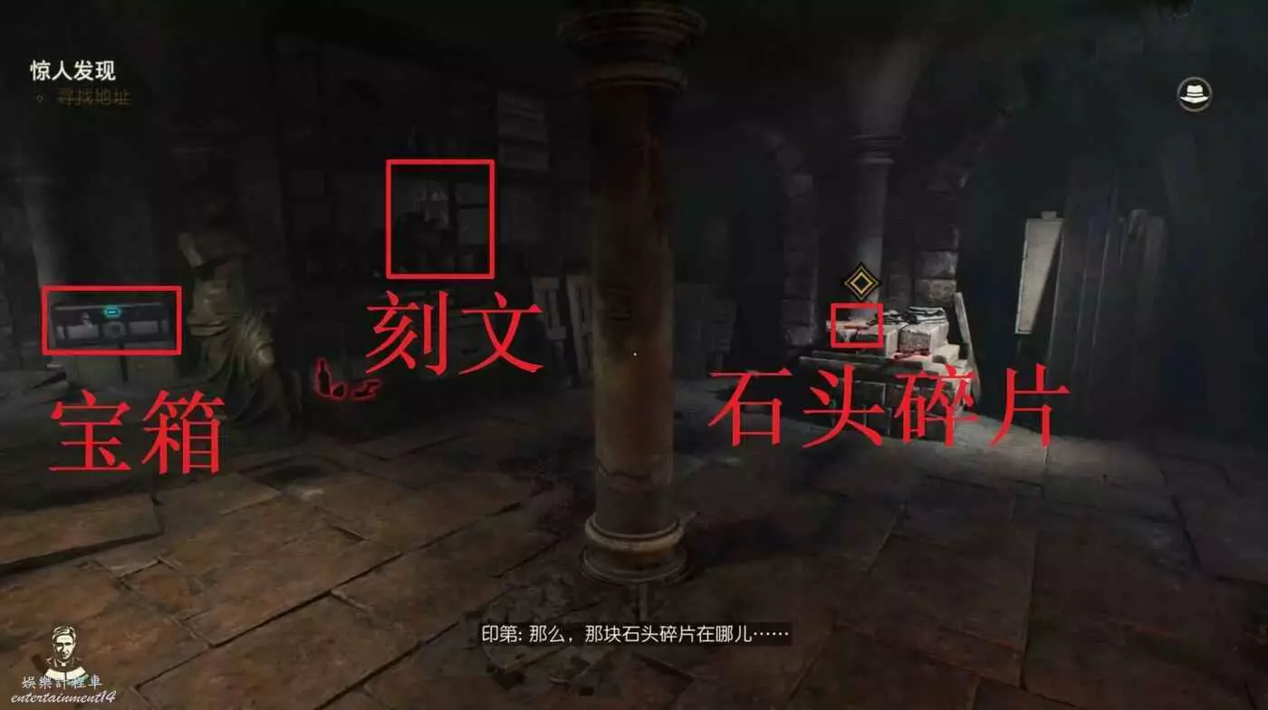 使用鑰匙進入地窖,對面就可以看到我們要找的【石頭碎片】,左邊有一個密碼箱,密碼箱右邊有一個新刻文。