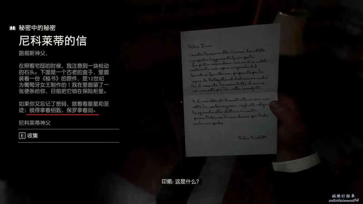 這個解密其實不用想的太複雜,四位元數的密碼,兩座雕像下面也剛好四個符號。已知聖·保羅的腳下對應數位按順序和符號來看是7和1。現在要知道的就是聖·彼得腳下的符號是哪個數,不過圖上並沒有找到,所以對應的肯定是那個空白的,也就是44。數位確定後就是順序的問題,順序直接看信就能知道誰在前面誰在後面。