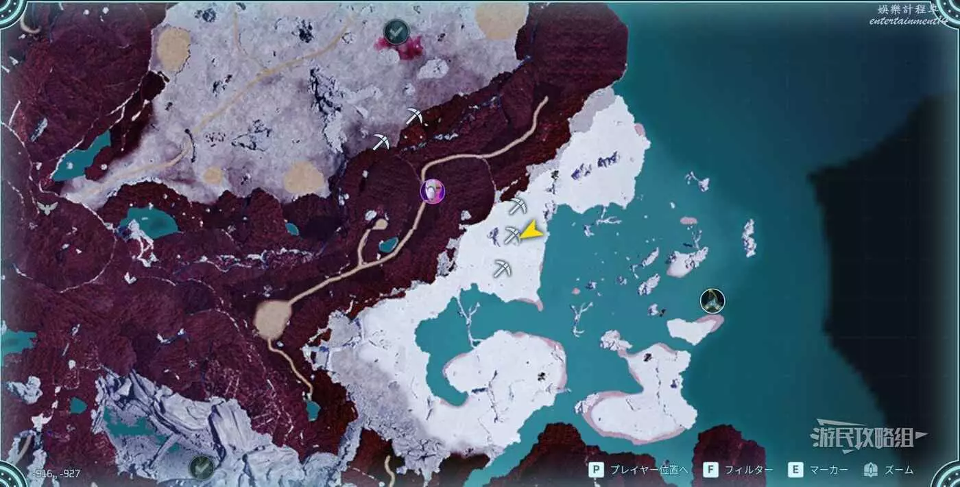 礦點位置首推天墜島右上角區域,附近傳送點為【燃灰之地(-811,-826)】,礦點座標-706,-1024附近。這裡有三個富集礦點,由於距離傳送點相對較遠,建議在這裡直接建造採礦據點。