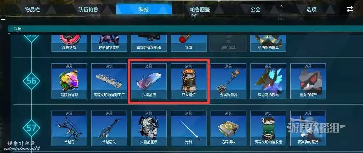 提煉【六棱晶錠】需要建造【巨大熔爐】(需科技56級,解鎖消耗科技點5,需要材料塑鋼×150、聚合物×100、噴火器官×200、古代文明部件×20)。