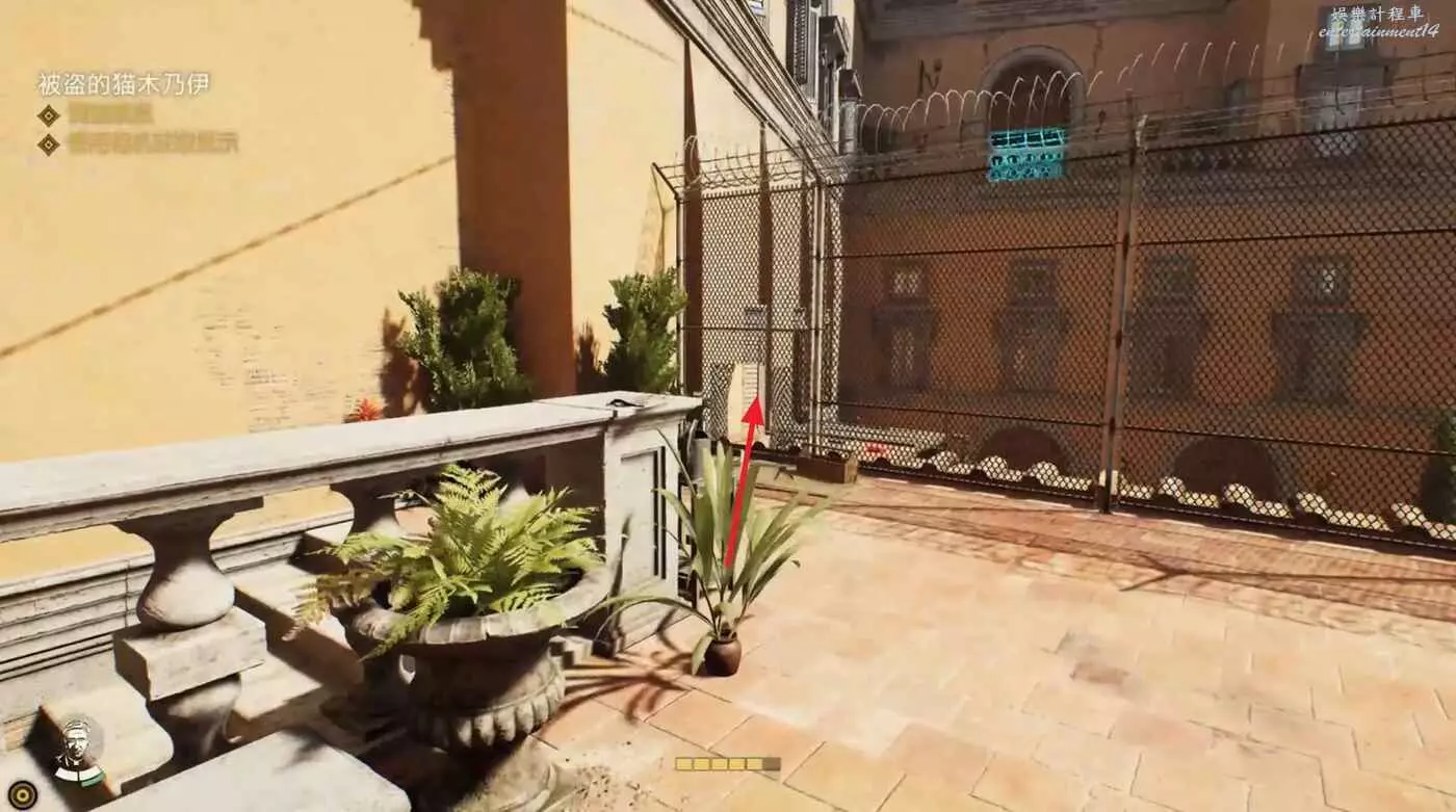 離開帳篷往對面的樓梯走,爬第一段樓梯就能看到吉娜給我們打開的小窗,先不要進去,沿著樓梯走到左邊高台,沿著高台的邊緣走到左側盡頭。
