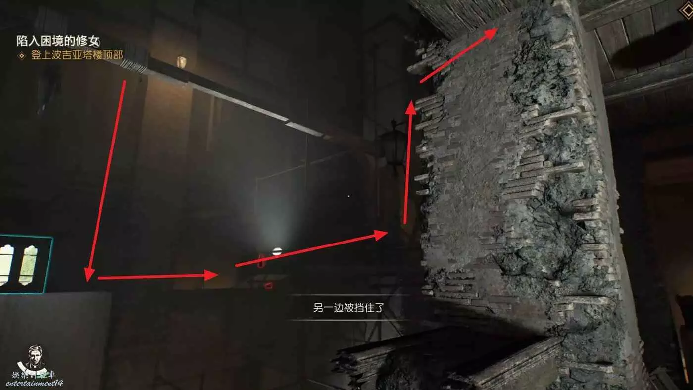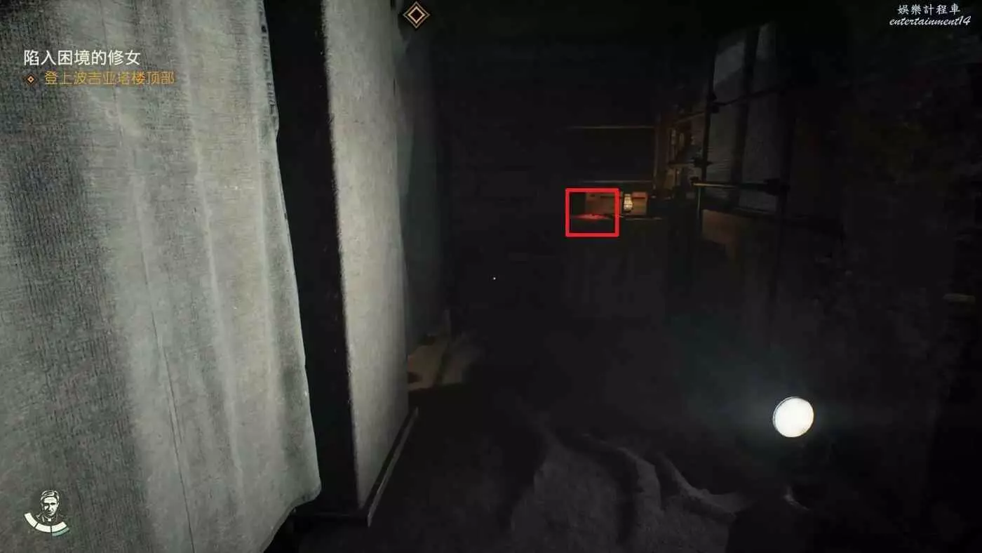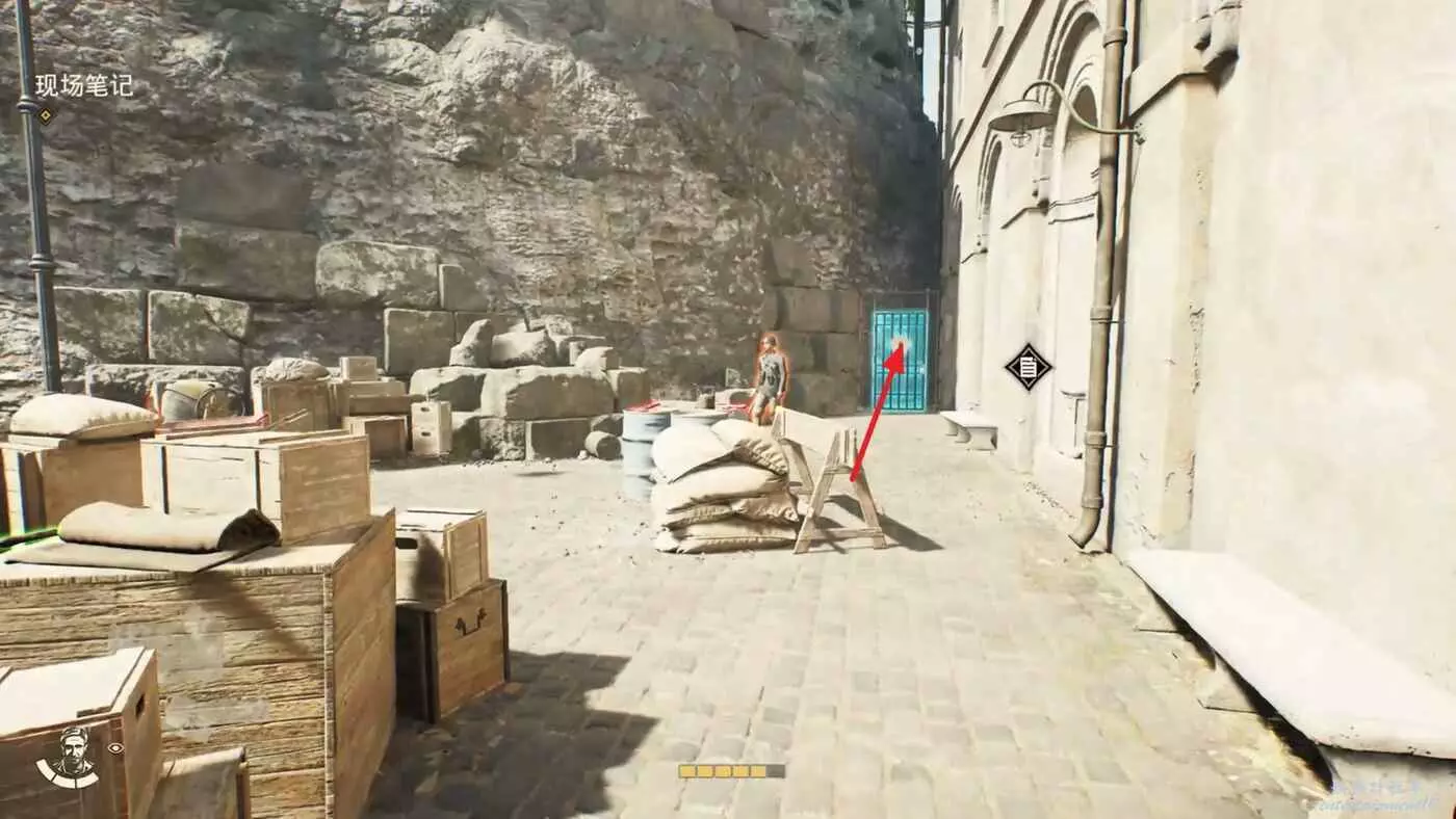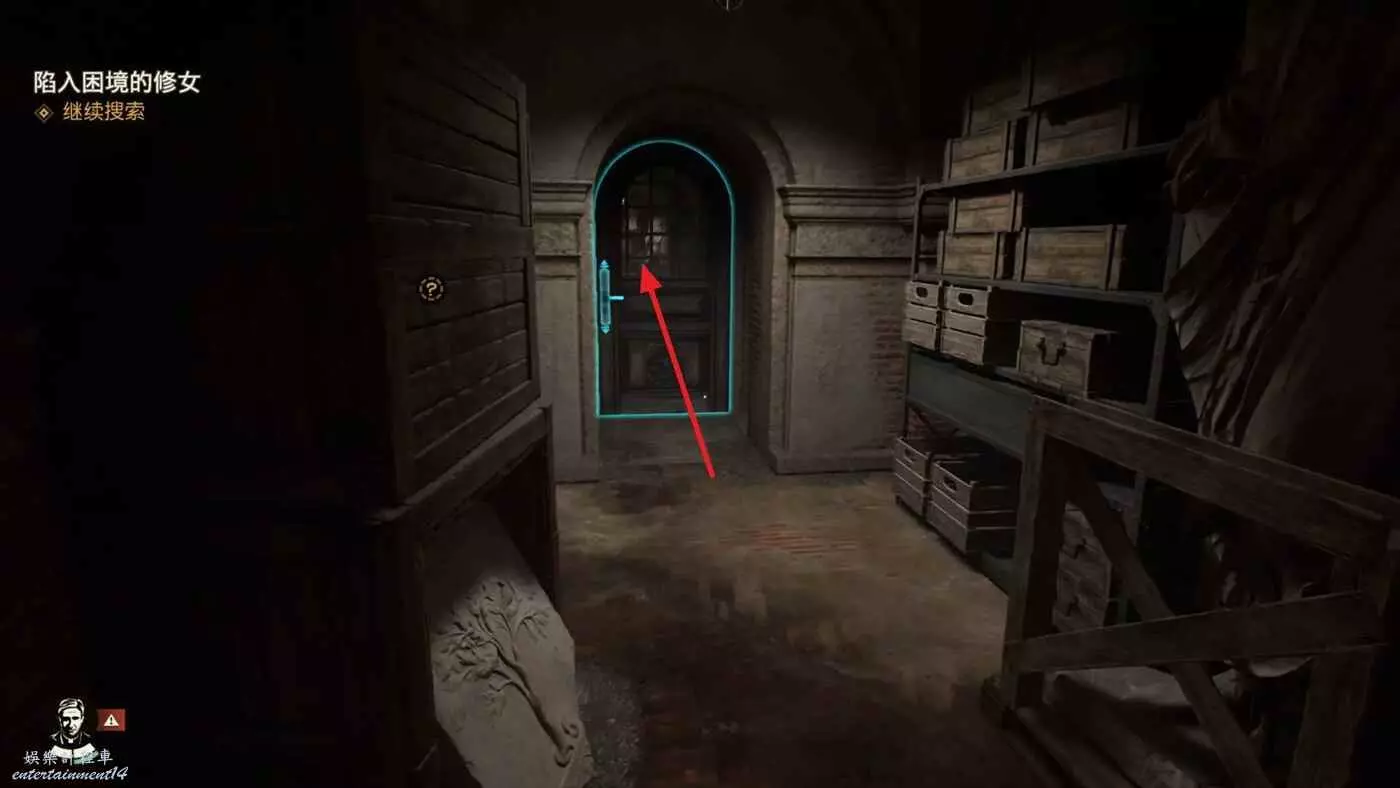 爬到挖掘現場後看到一個可疑的修女進入了這個區域入口左邊無法打開的門內。
