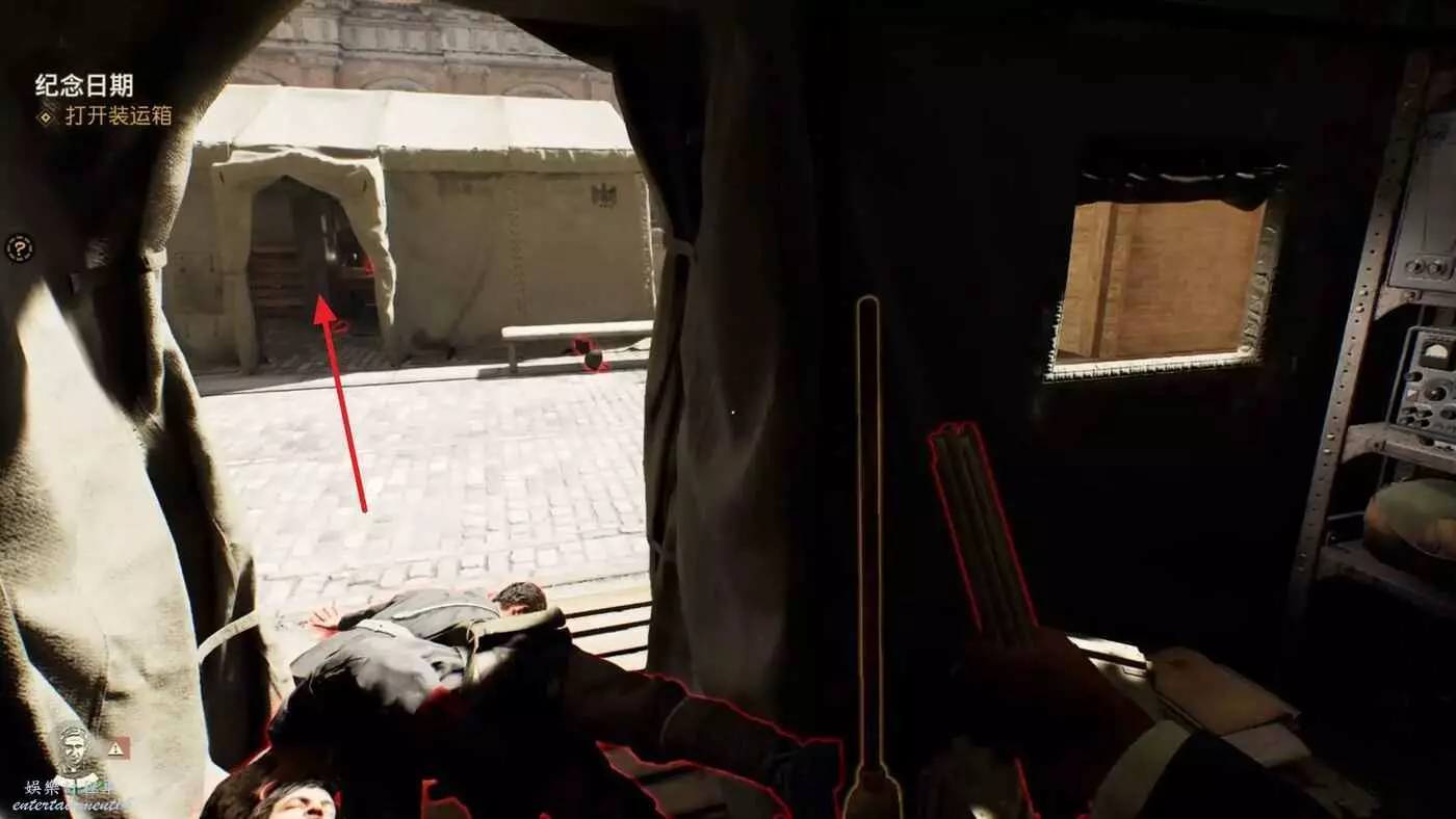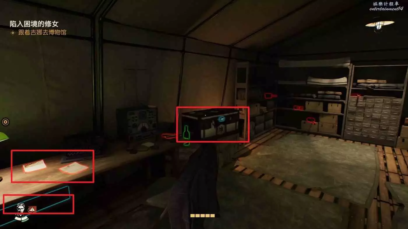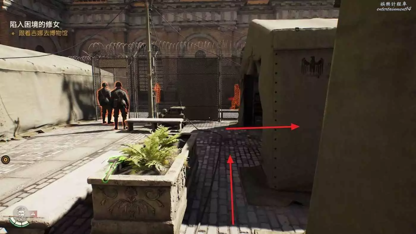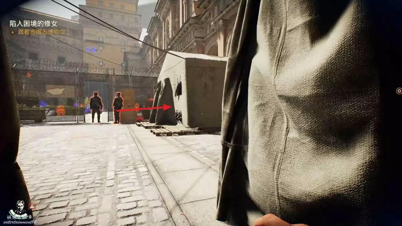 先直走一段,進入左邊第二個帳篷,裡面有兩個敵人,悄悄解決掉。