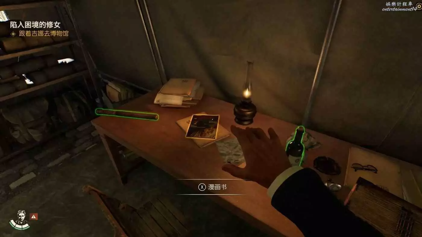 這個帳篷裡可以拿到冒險書籍【搏鬥家2】,左邊抽屜裡可以拿到不少錢,抽屜上方的桌子上可以拿到筆記【運輸報告】,開啟新謎團【紀念日期】。
