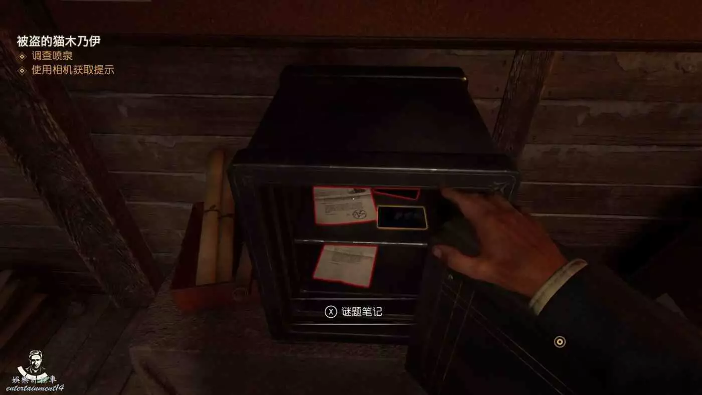 通過密碼【5873】打開保險櫃,裡面可以獲得筆記【錫瓦照片】、【小亨利報告】、【辦公室照片】、【老亨利報告】完成謎團【父與子】。