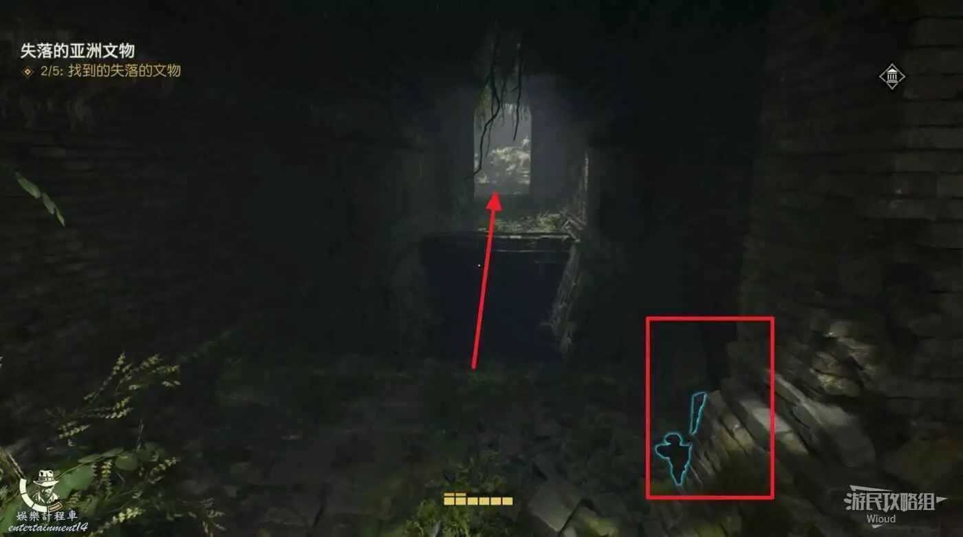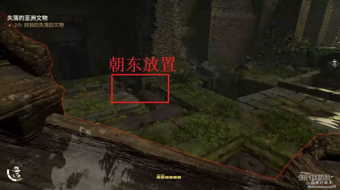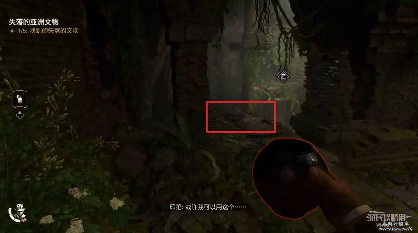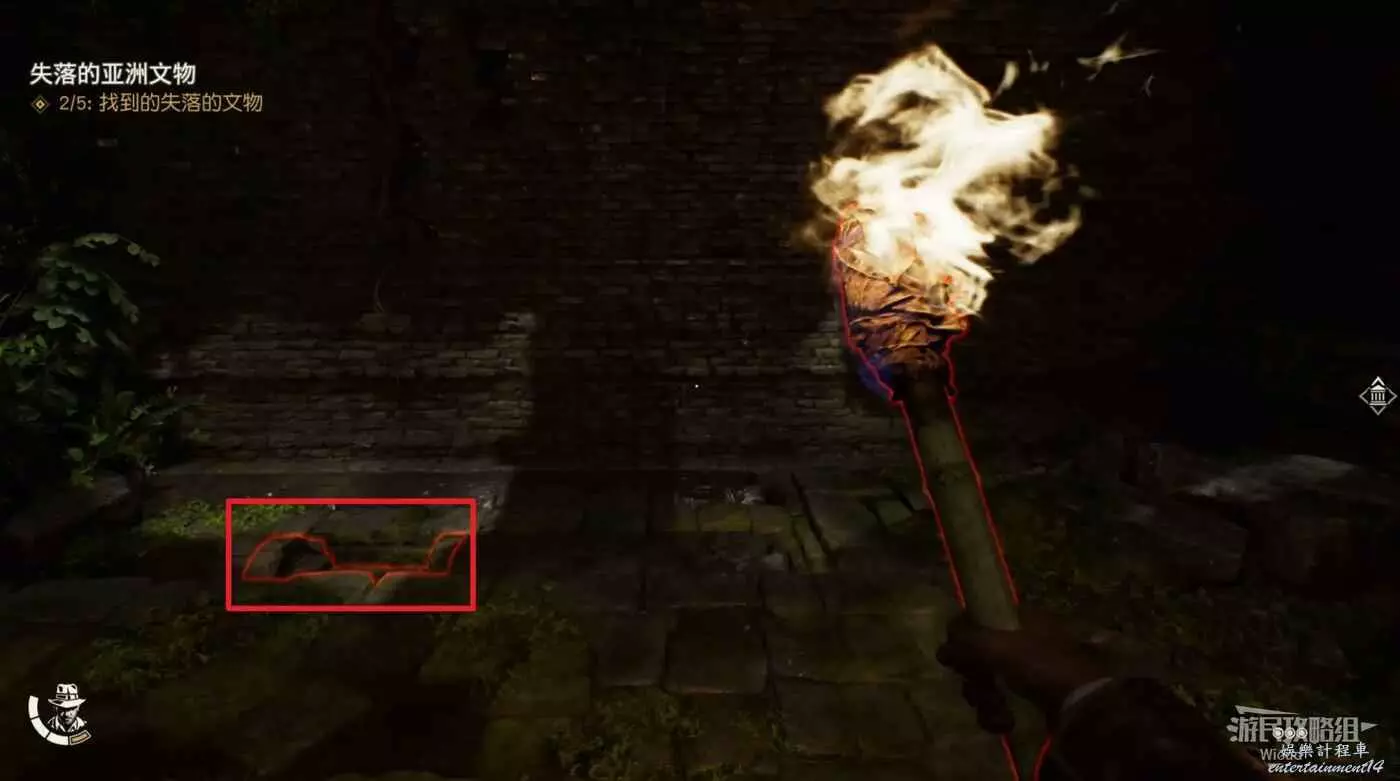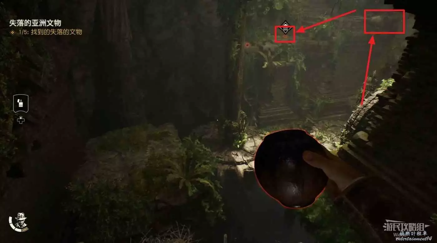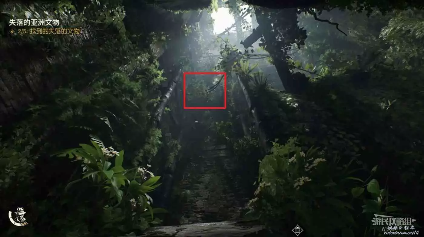 下圖右側紅框內有一個失落的文物可以拿,先走到右側的牆邊,用打火機點燃炸彈扔到紅框所示的雜草上。