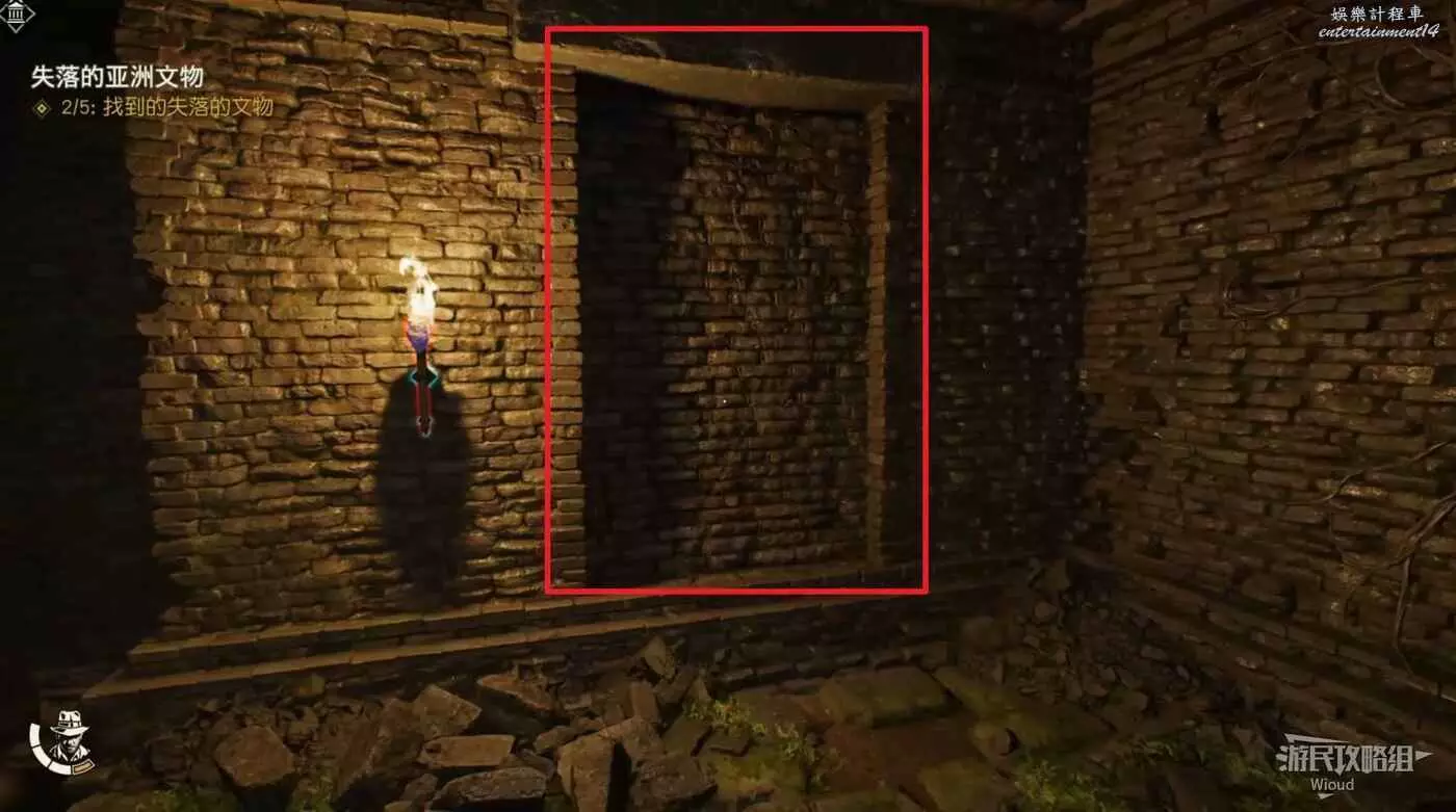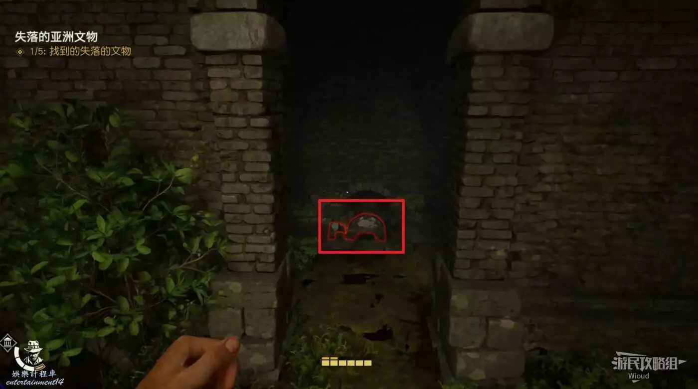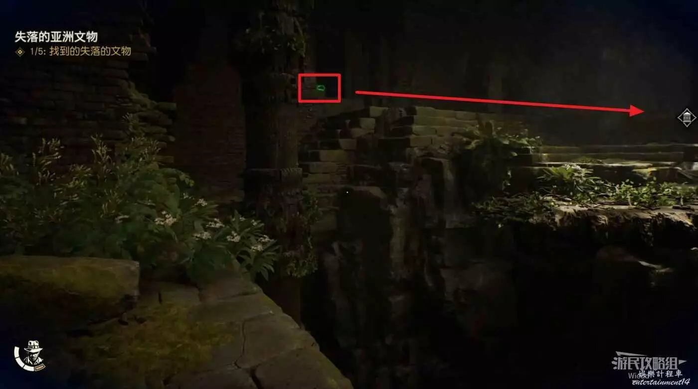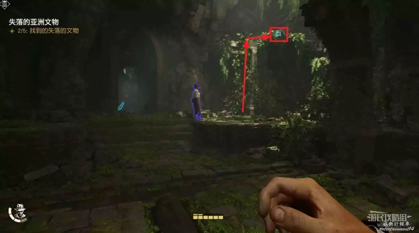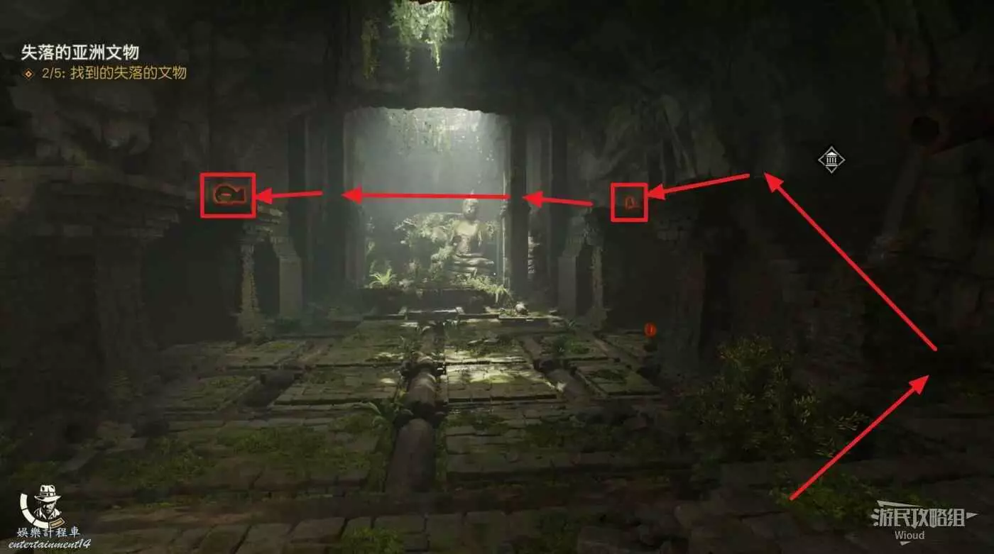 下圖右側紅框內有一個失落的文物可以拿,先走到右側的牆邊,用打火機點燃炸彈扔到紅框所示的雜草上。