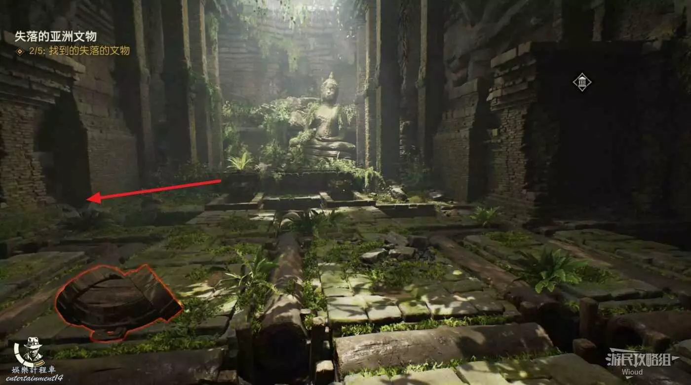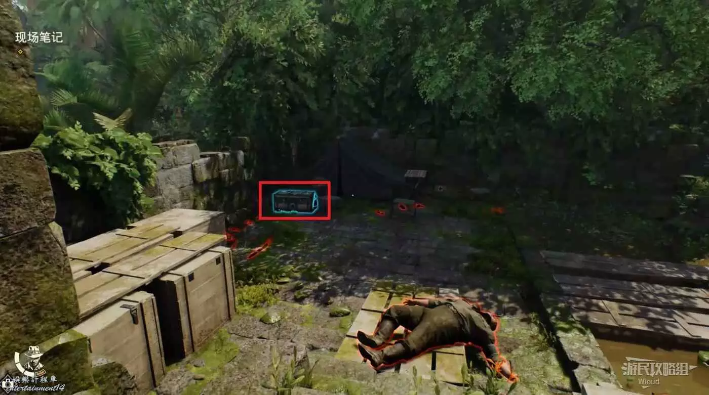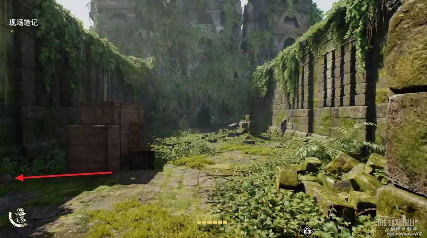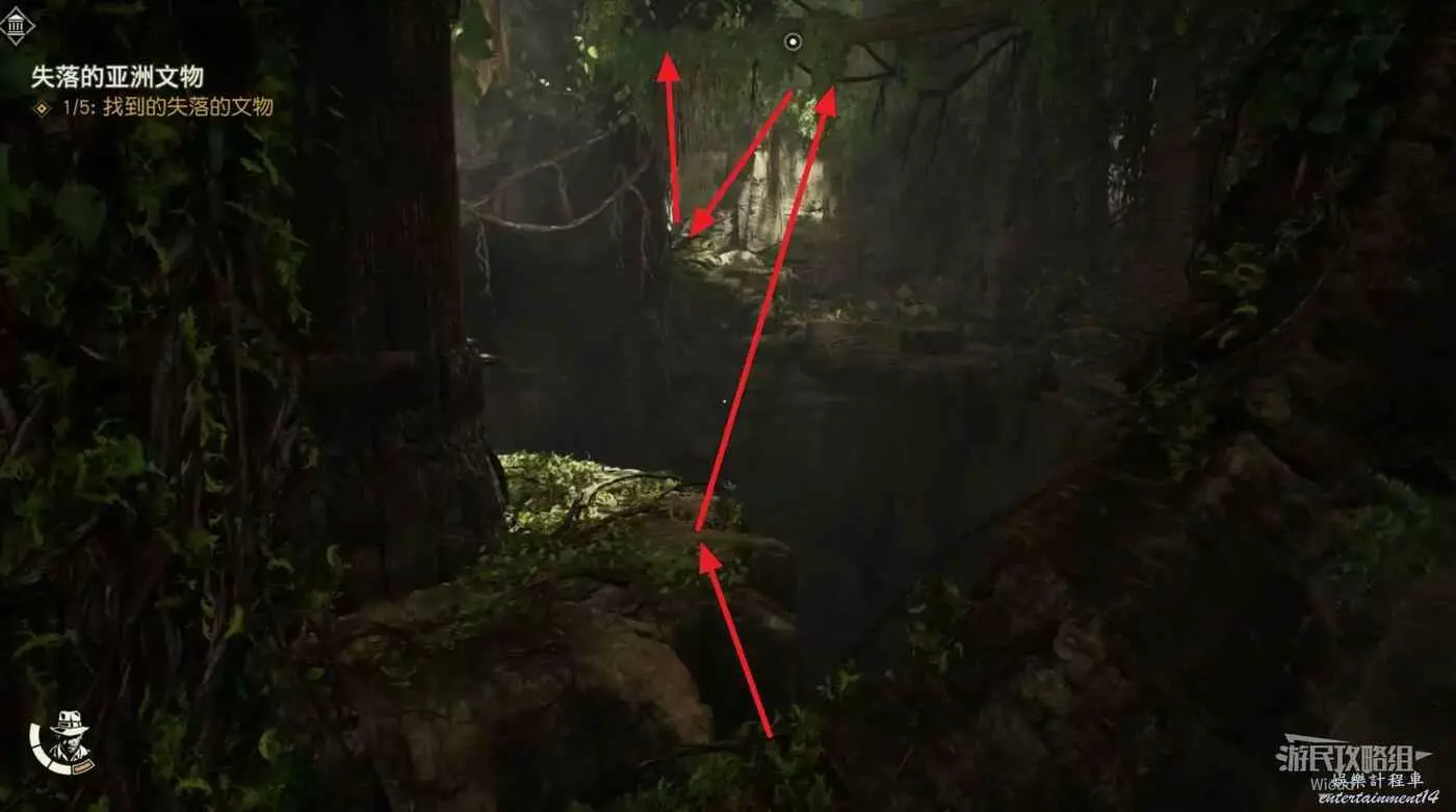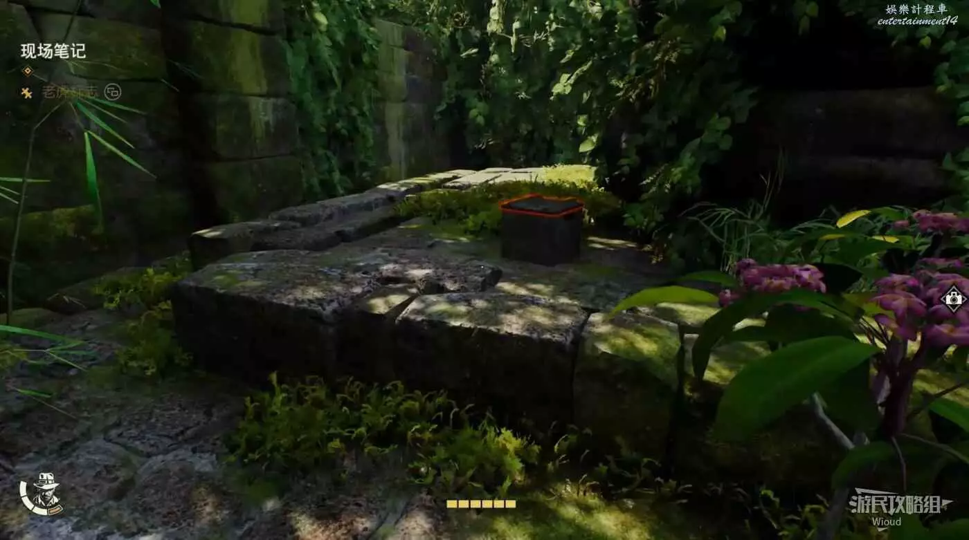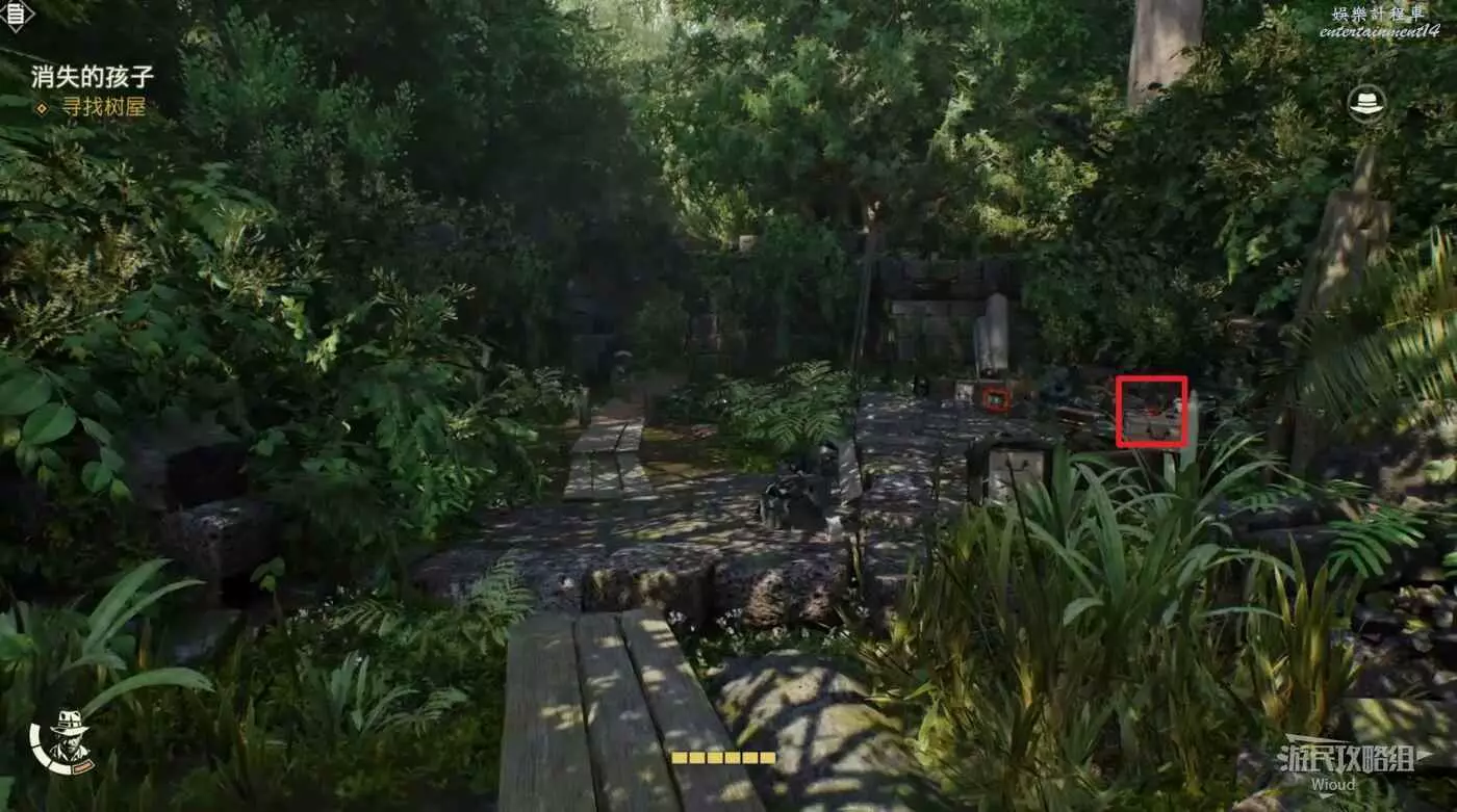 下圖右側紅框內有一個失落的文物可以拿,先走到右側的牆邊,用打火機點燃炸彈扔到紅框所示的雜草上。