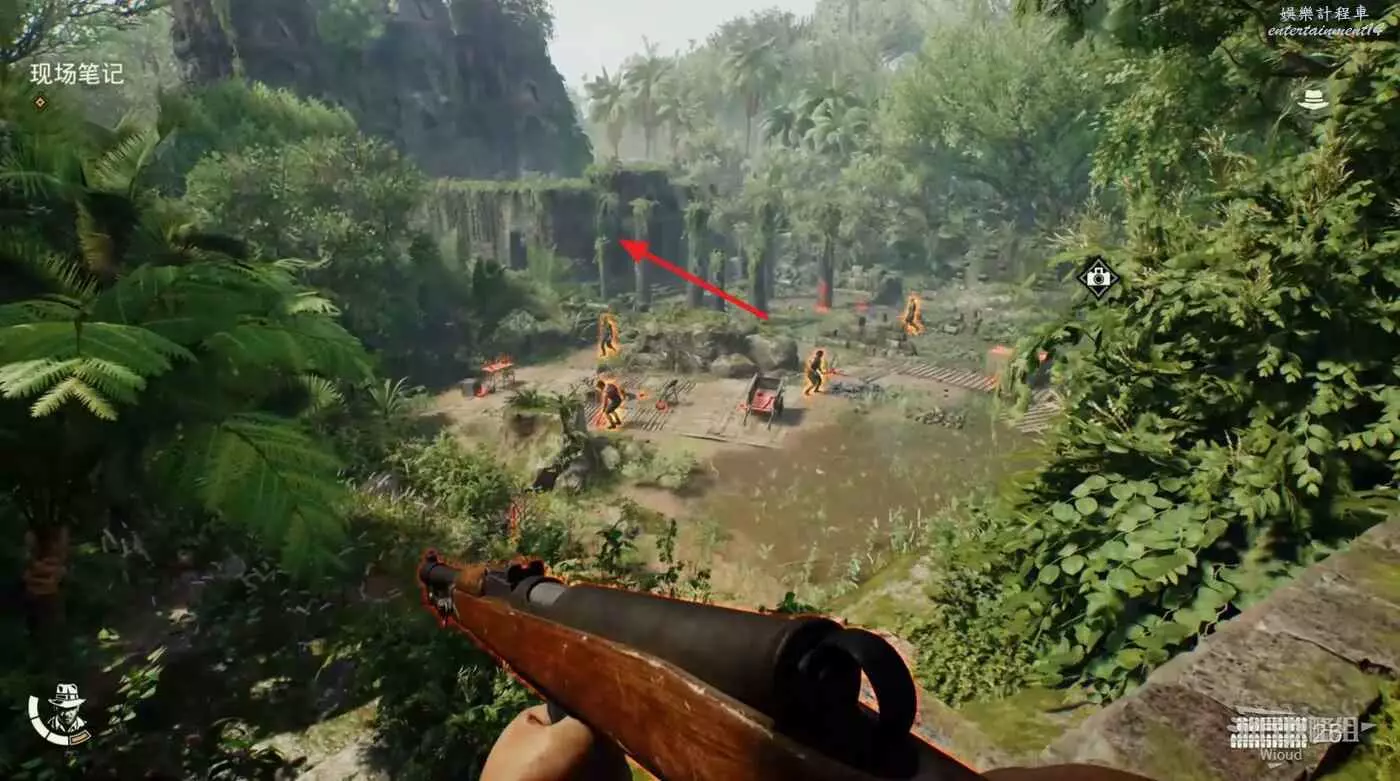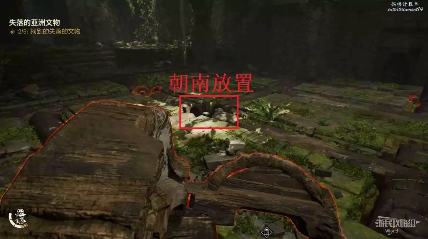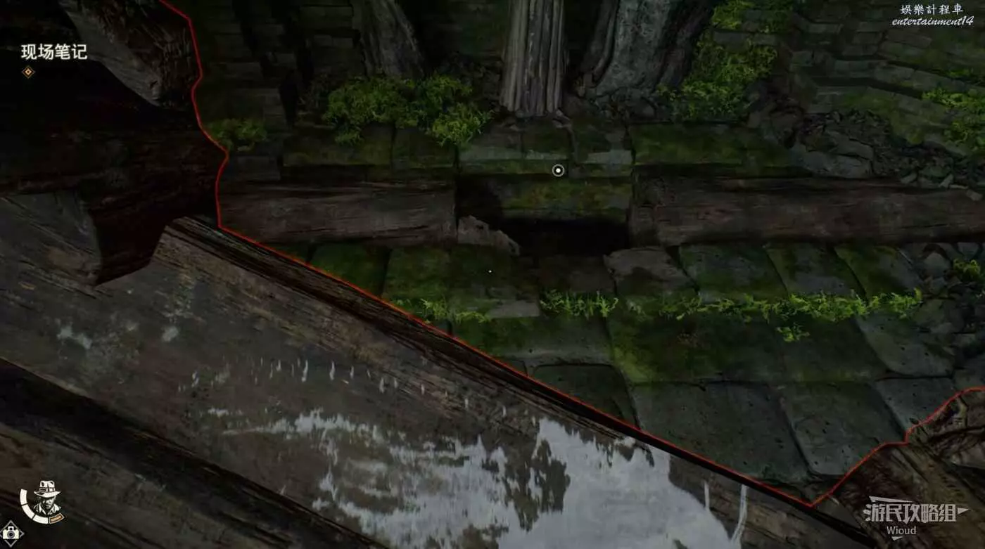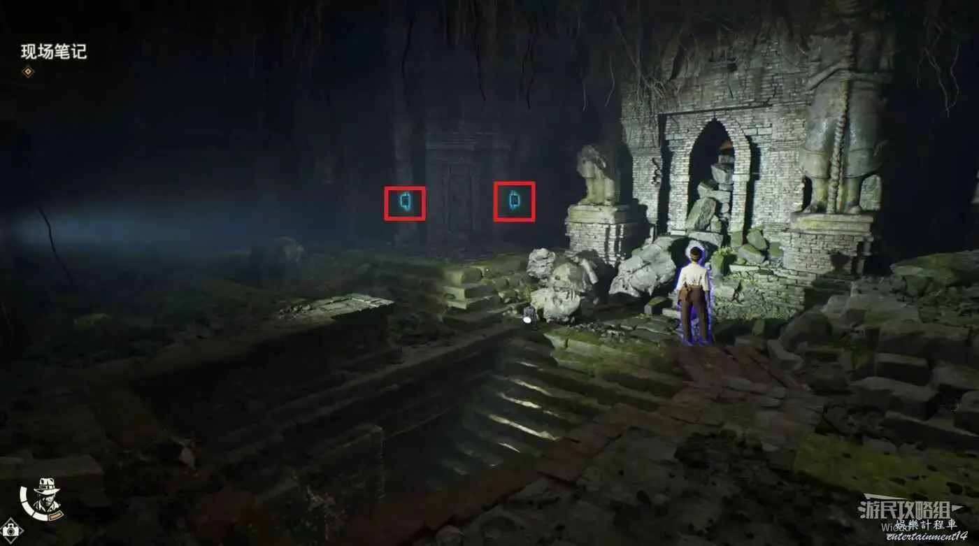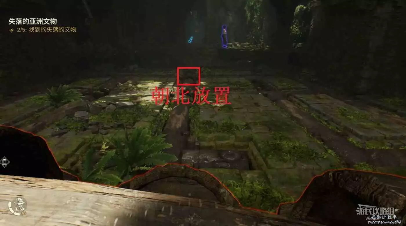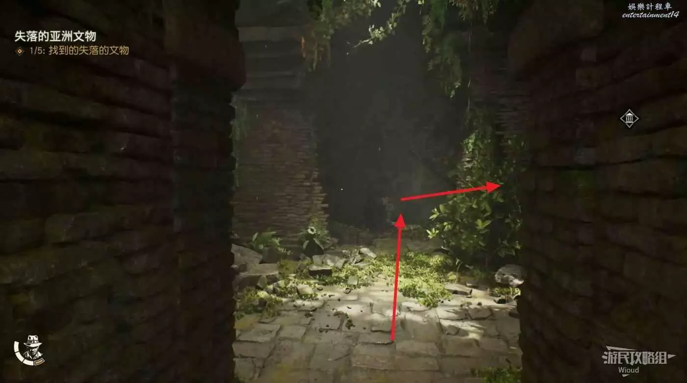 下圖右側紅框內有一個失落的文物可以拿,先走到右側的牆邊,用打火機點燃炸彈扔到紅框所示的雜草上。