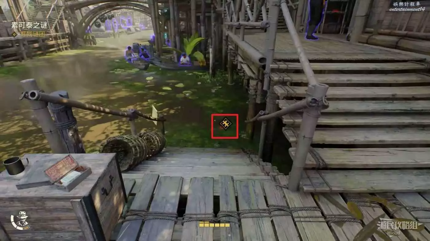 這裡有一個NPC釣魚,他旁邊的石頭上有一個瓶子,拿起來砸碎可以獲得筆記【第三個瓶子的資訊】。