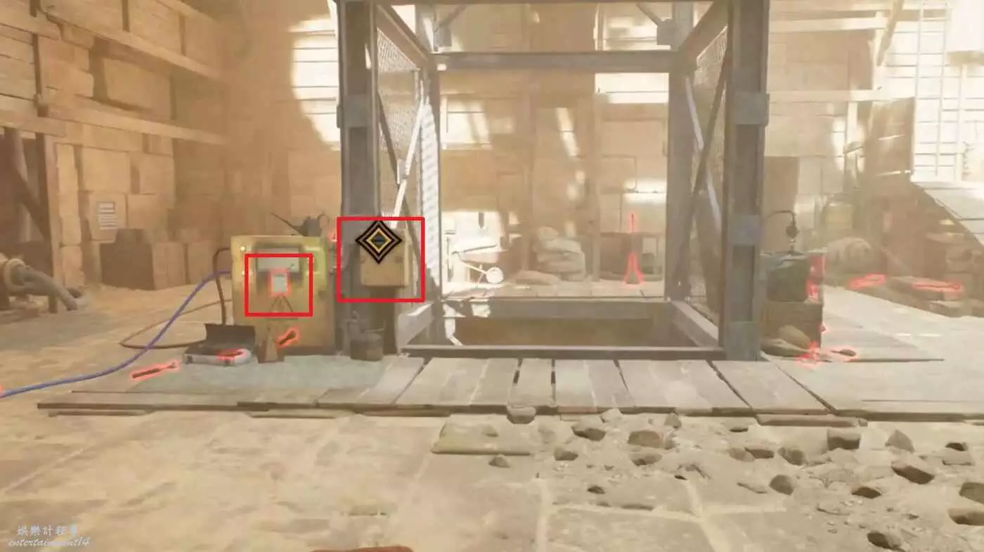 離開房間,電梯機關左邊可以拿到筆記【故障通知】,然後與機電梯互動,操控電梯下去。