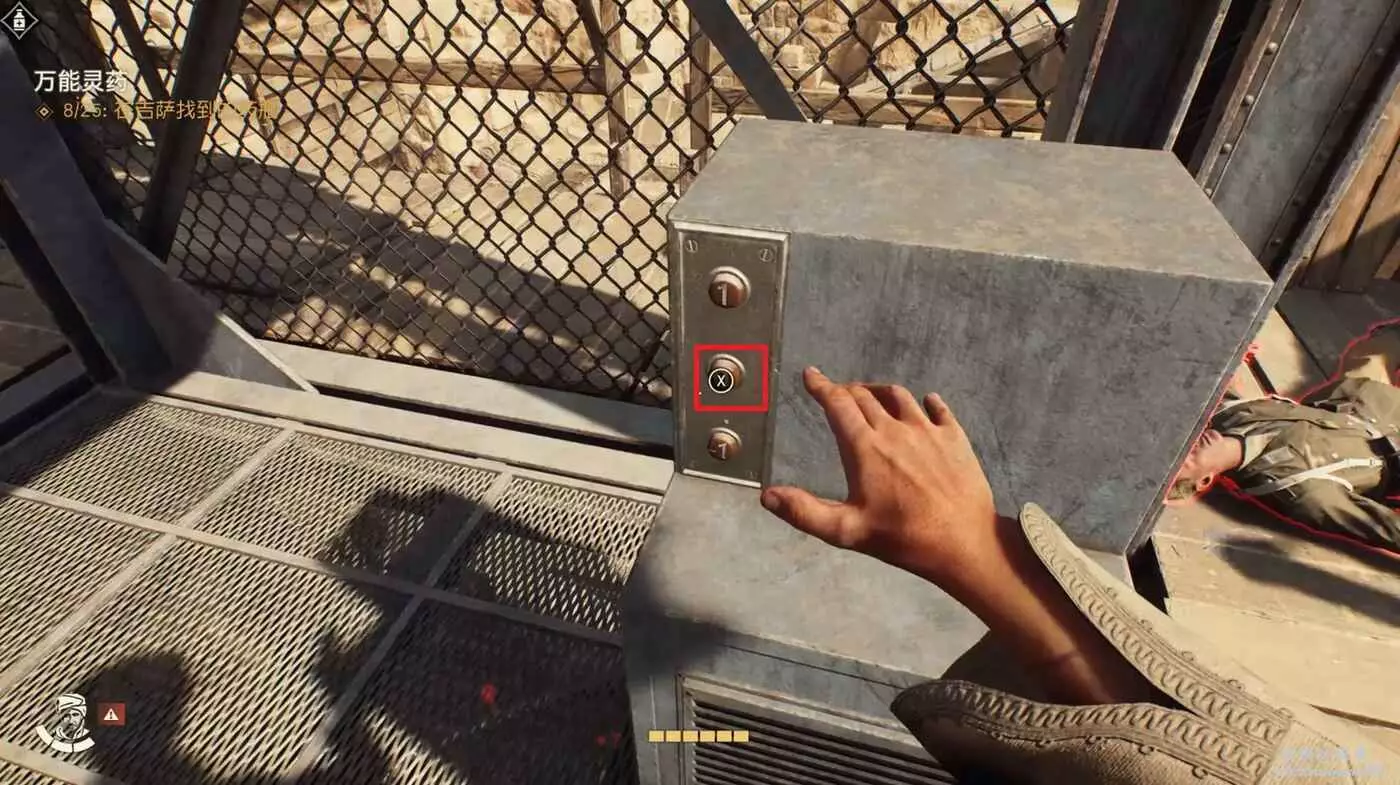 打開盡頭的柵欄門回到外部電梯區域。